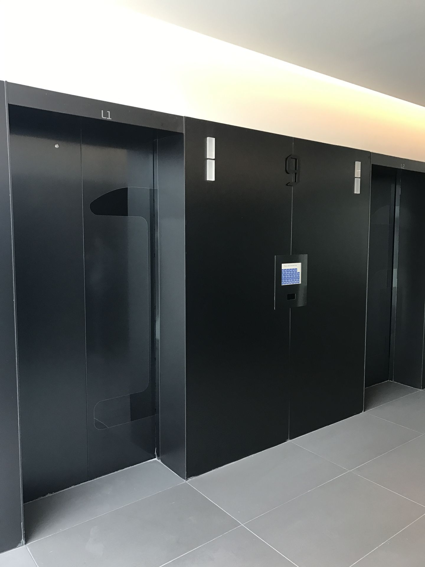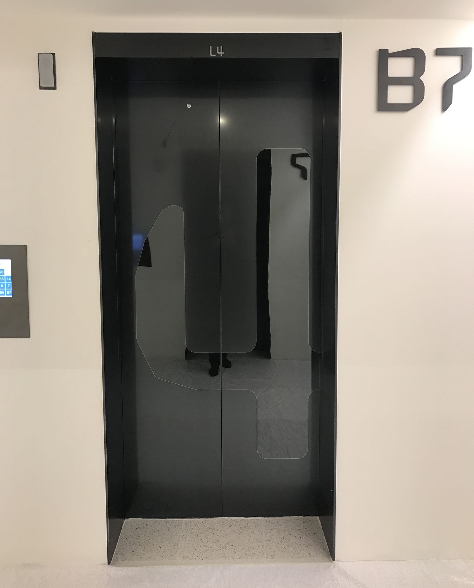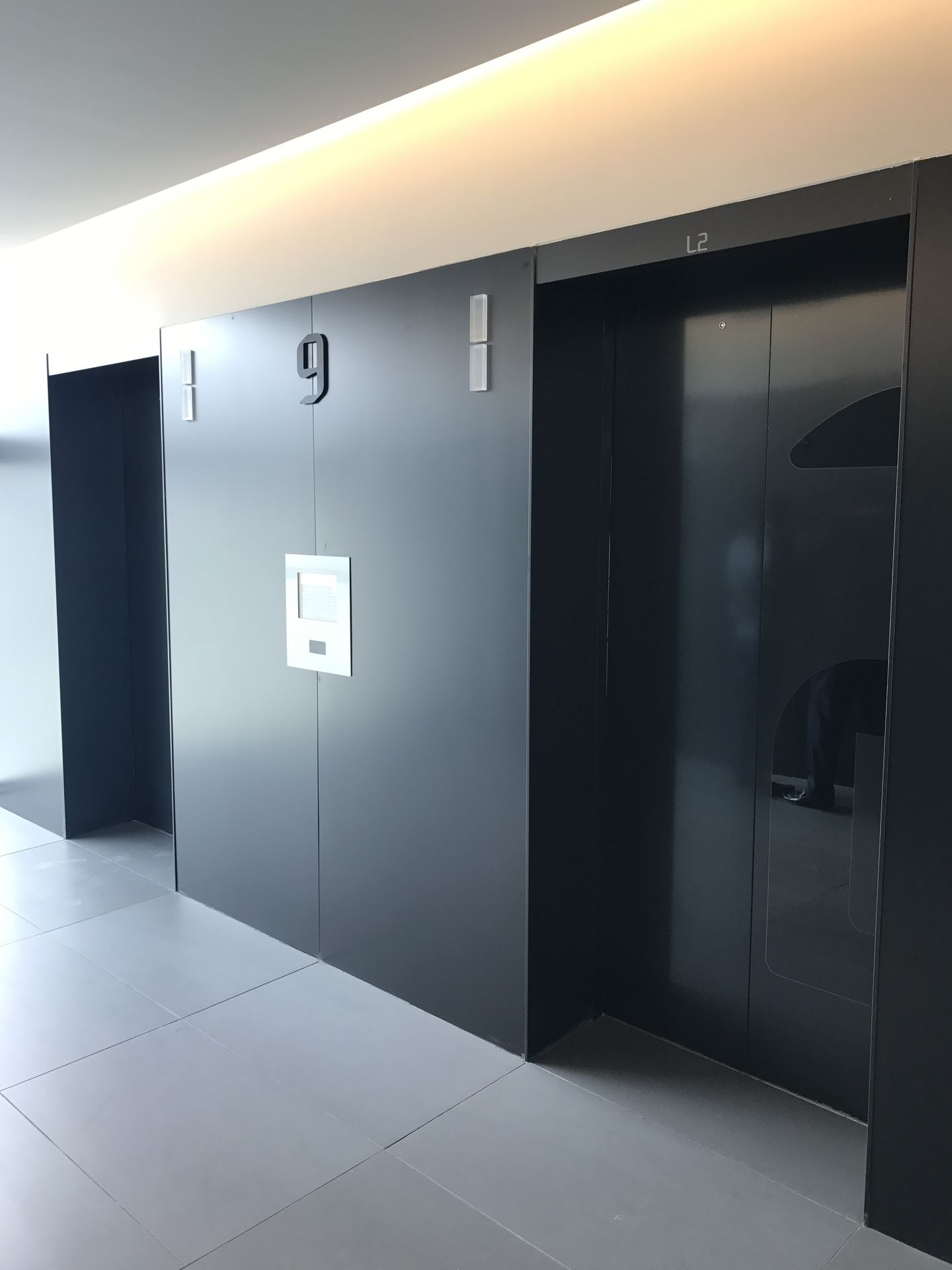 엘리베이터 출입문과 그 주변 벽면에는 Galaxy Black MIST 마감이 적용되어, 공간에 차분하면서도 세련된 분위기를 부여합니다. 미세하게 분산된 입자감은 표면에 깊이 있는 질감을 형성하고, 빛의 각도에 따라 은은한 반사를 일으켜 입구 공간을 고급스럽게 연출합니다. 이러한 마감은 반복적으로 이용되는 공간에 내구성과 미적 가치를 동시에 제공하며, 건축물의 인테리어 아이덴티티를 강화하는 요소로 작용합니다.