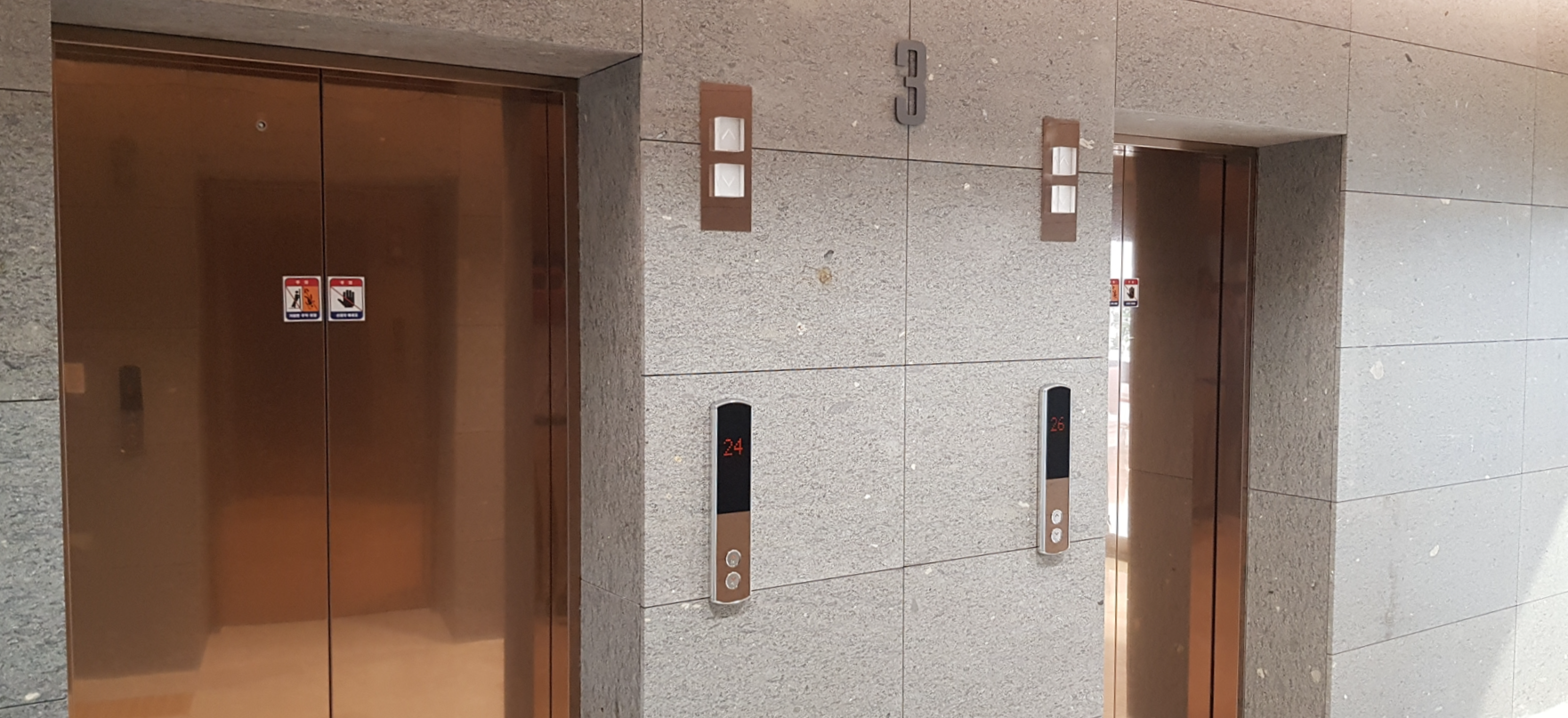 엘리베이터 출입부는 Whiskey Brown HANJI 마감으로 꾸며져, 따뜻하면서도 차분한 분위기를 자아냅니다.