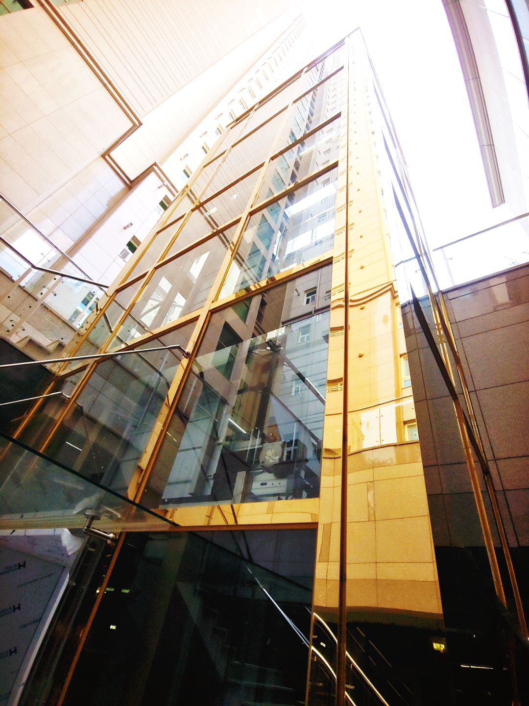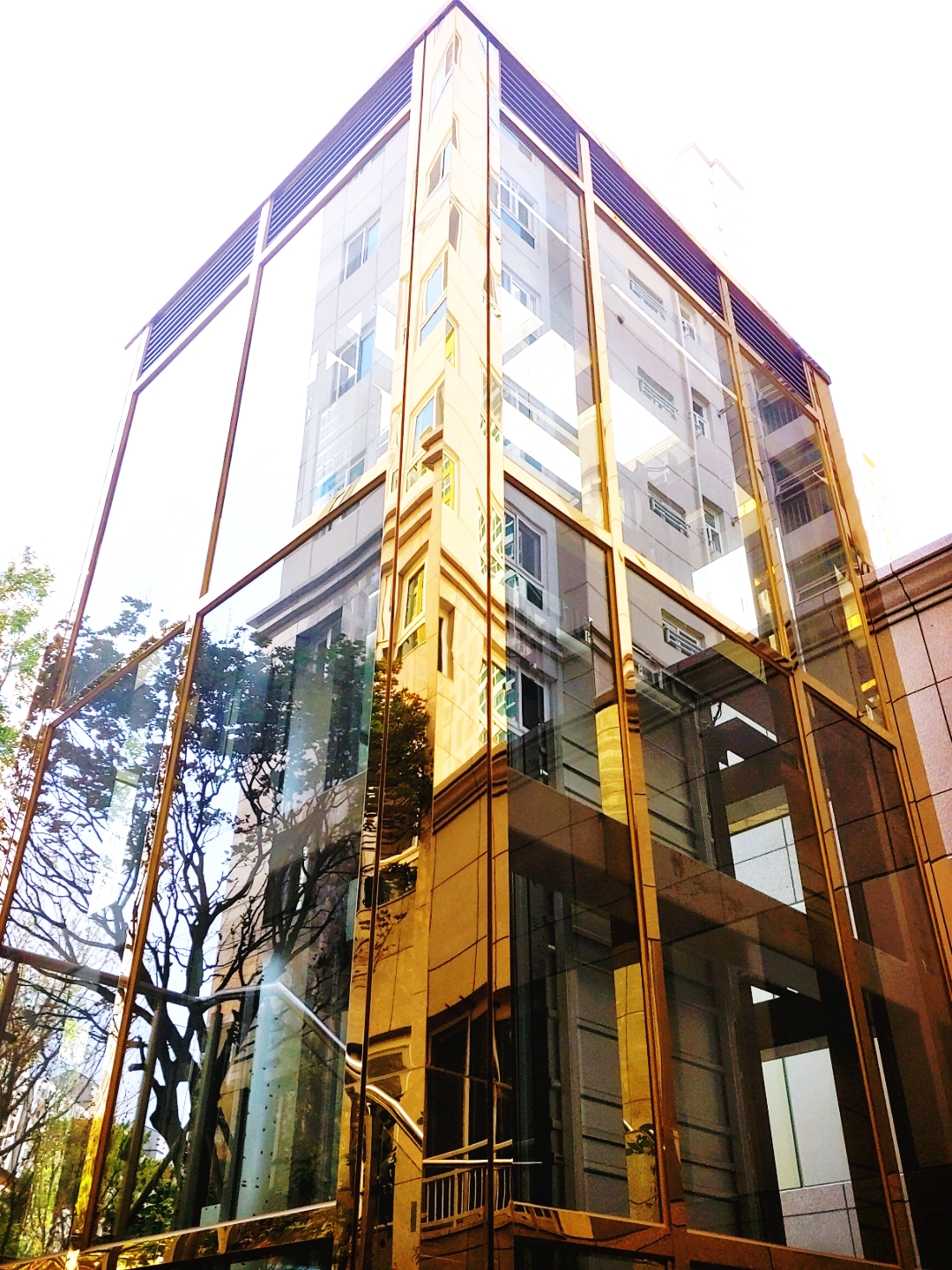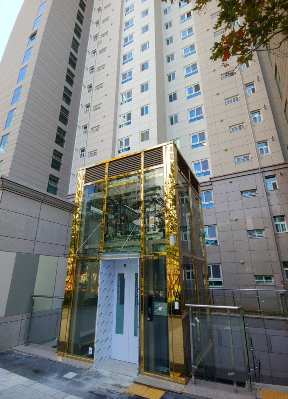Gold MR의 만남. 야외 아파트 엘리베이터 외관은 Gold MR로 전체를 마감하여 화려하면서도 세련된 분위기를 연출하였습니다. 골드 미러의 반사 효과는 주변 경관과 자연스럽게 어우러지며, 시간대와 조명에 따라 다채로운 표정을 보여줍니다. 특히, 강렬하면서도 품격 있는 황금빛 외관은 건축물의 상징성을 높이고, 입주민과 방문객 모두에게 강렬한 첫인상을 전달합니다.