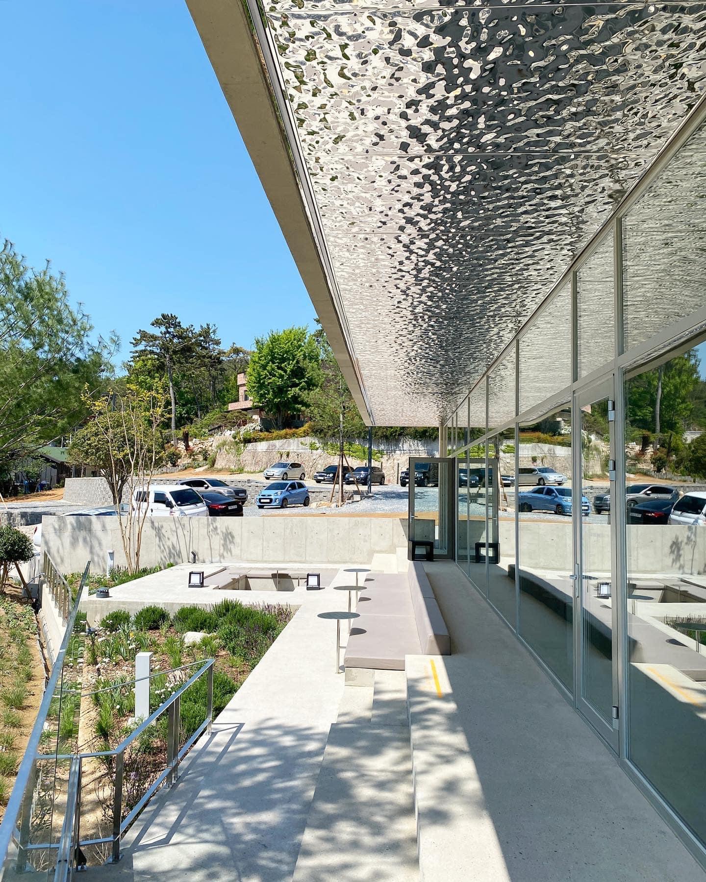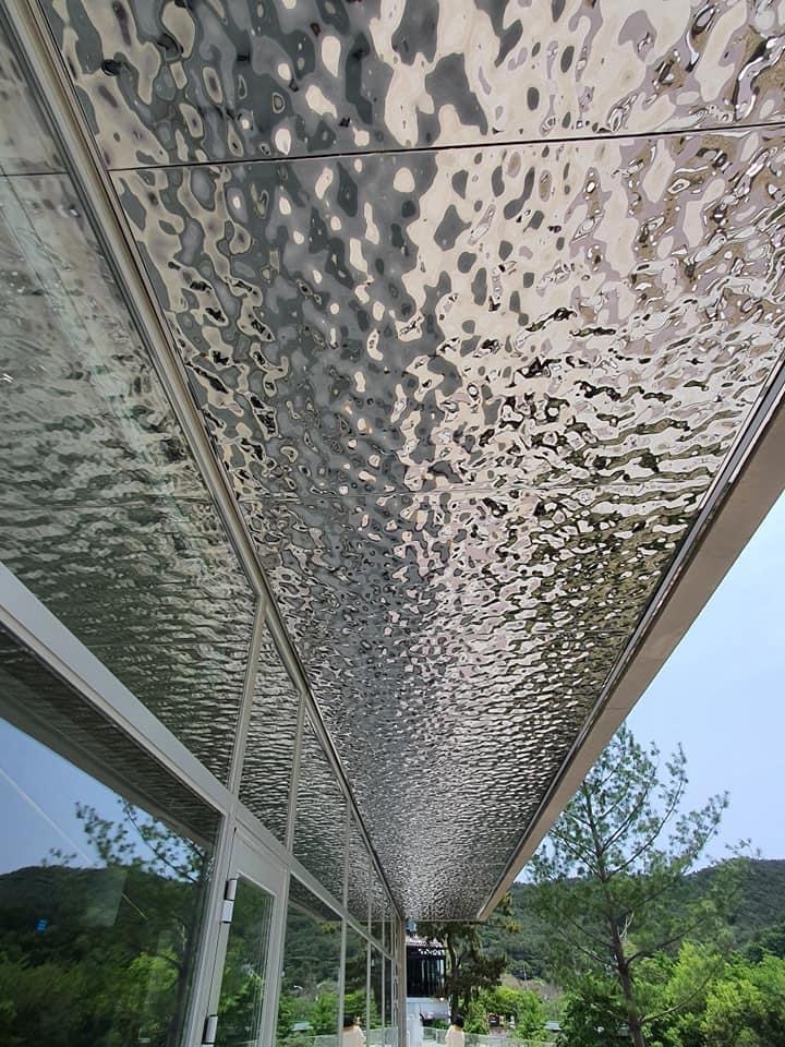 카페 천장에는 Silver MR RIPPLE 제품을 적용하여 불규칙하게 흐르는 물결무늬가 공간에 독창적인 개성을 부여하였습니다. 전체 인테리어와 조화를 이루면서도, 천장 디자인이 은은한 포인트 역할을 하여 세련된 분위기를 완성합니다. 물결 패턴은 자연스러운 유동감을 전달하며, 카페 공간에 편안함과 현대적인 감각을 동시에 더해줍니다.
