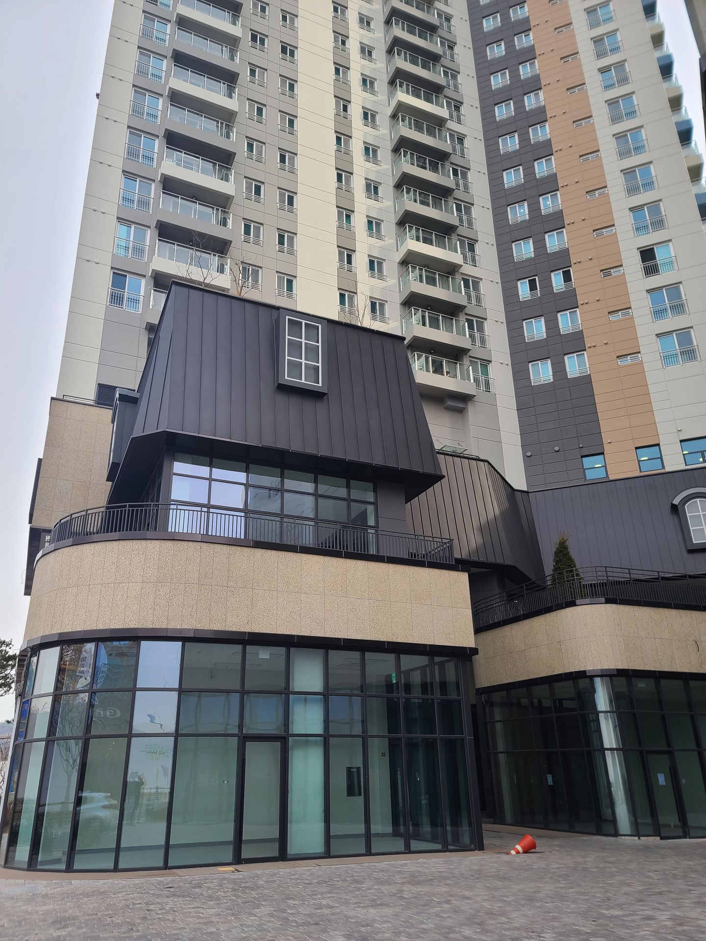 Galaxy Black HL 마감을 건물 통창벽 프레임에 적용되어, 깊고 강렬한 블랙 톤이 공간에 안정적이면서도 현대적인 분위기를 조성합니다. 빛의 반사와 그림자의 대비가 공간의 깊이감을 강조하며, 외부와 내부를 연결하는 통창 구조가 마치 프레임 안에 완성된 작품처럼 보이도록 합니다. 세련된 도시적 감각을 유지하면서도 공간 전체의 집중도와 통일감을 높이는 연출이 특징입니다.