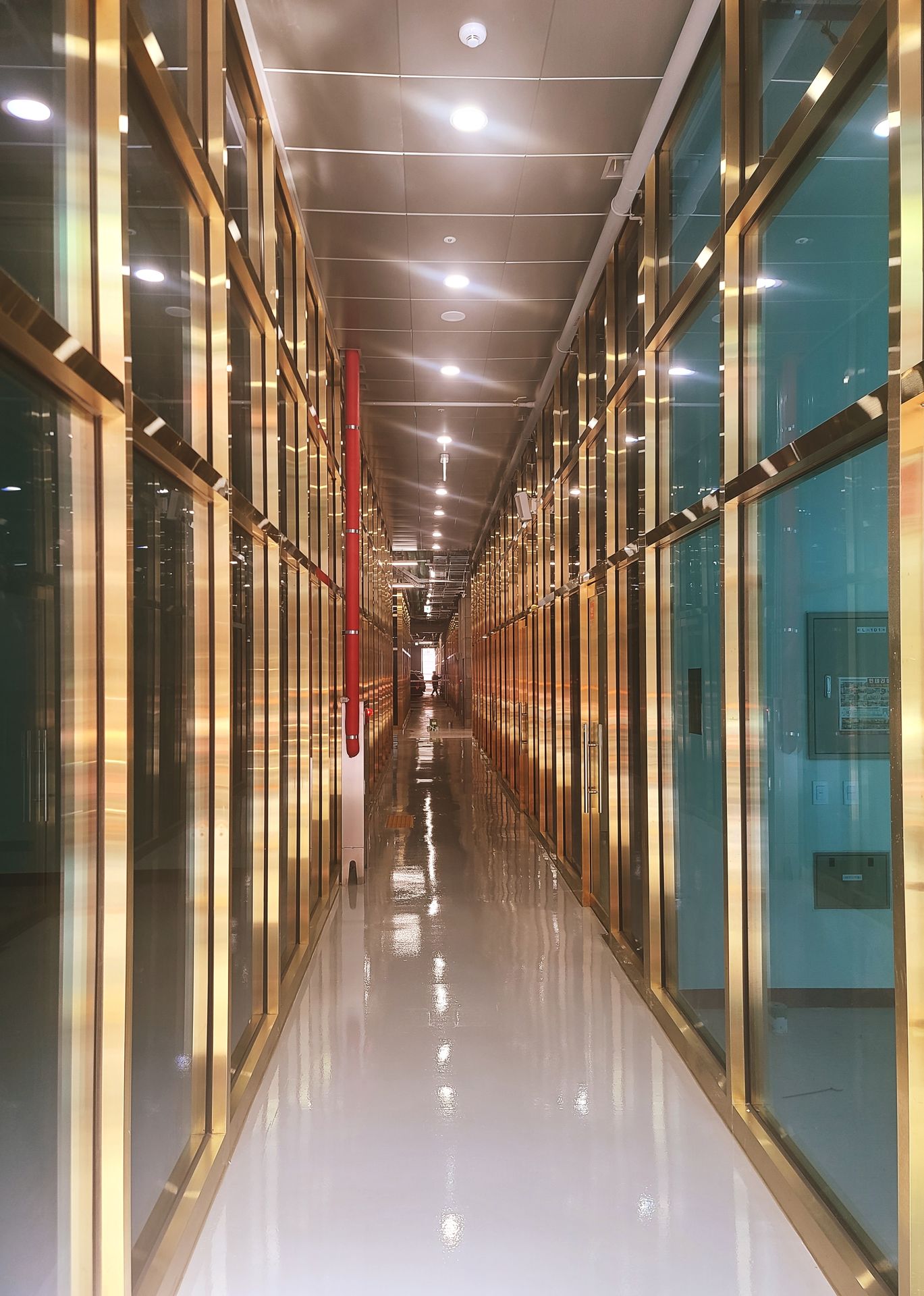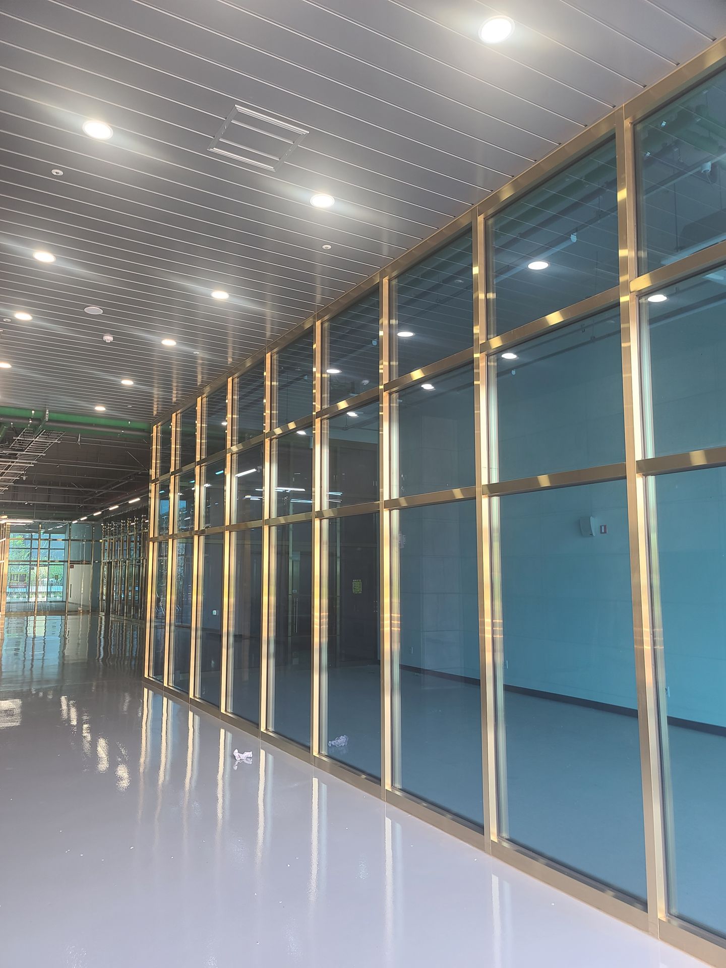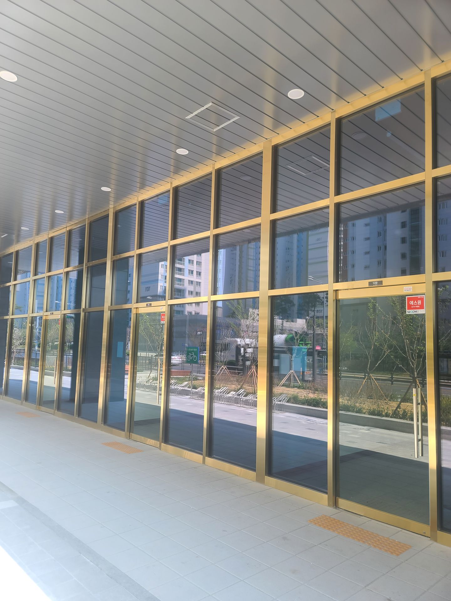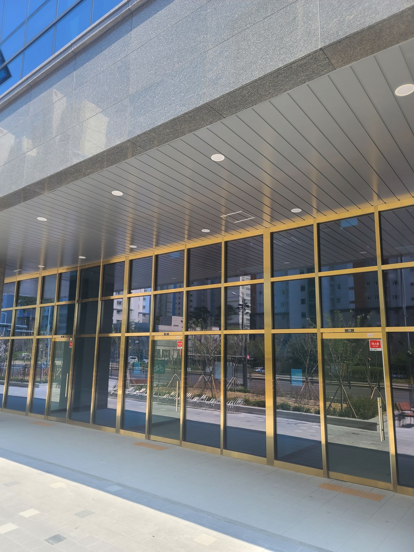 Gold HL 마감은 상가 출입구와 내부 통창 벽 프레임 전체에 적용되었습니다. 은은한 금빛이 자연광과 실내 조명을 받아 공간에 따뜻하면서도 세련된 광채를 선사하며, 고급스러운 분위기를 자연스럽게 연출합니다. 통창을 통해 들어오는 외부 빛과 내부 조명의 반사가 조화를 이루어, 방문객에게 입구에서부터 품격 있는 첫인상을 제공합니다. 전체 공간이 금빛으로 은은하게 감싸이는 효과 덕분에 세련된 도시적 감각과 우아한 건축적 분위기가 동시에 느껴집니다.