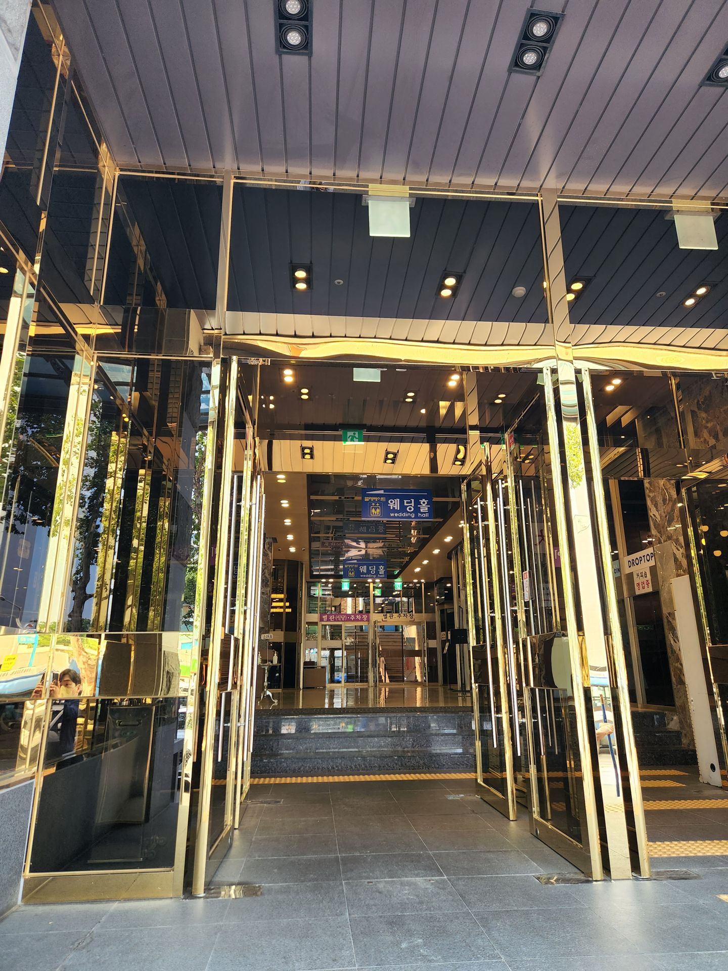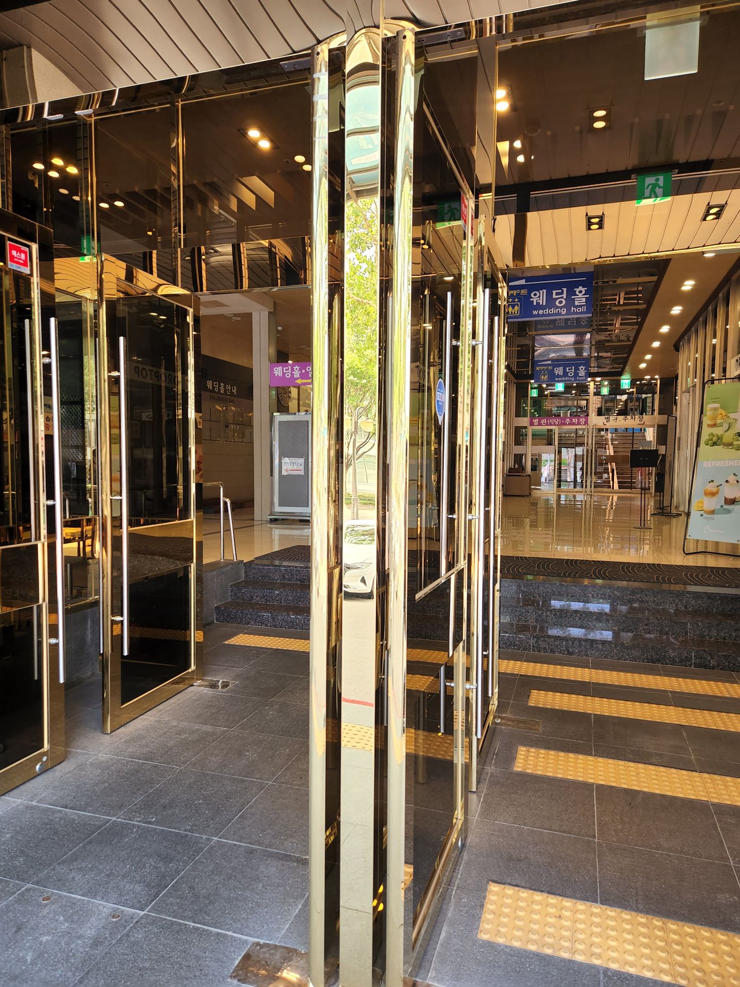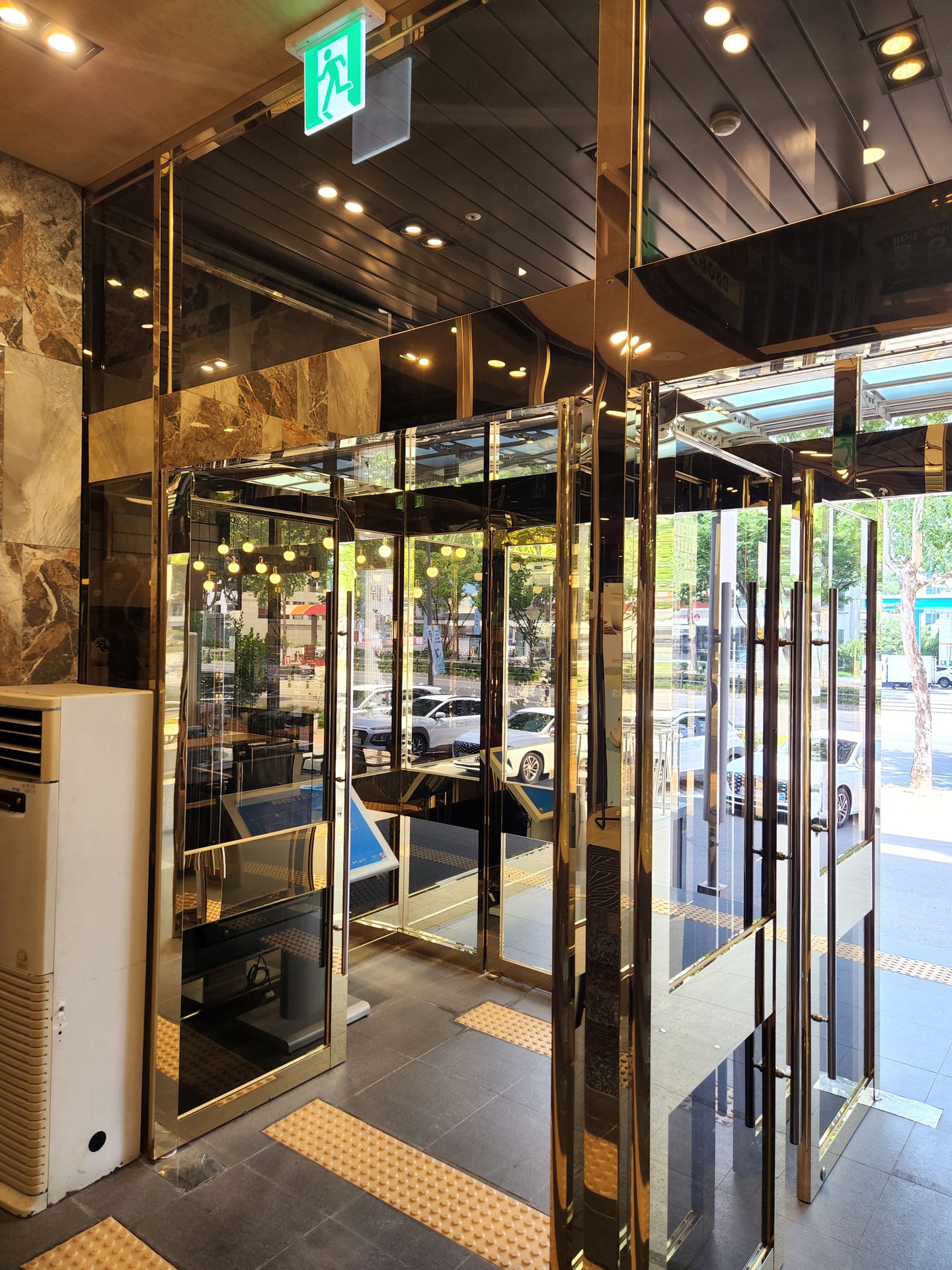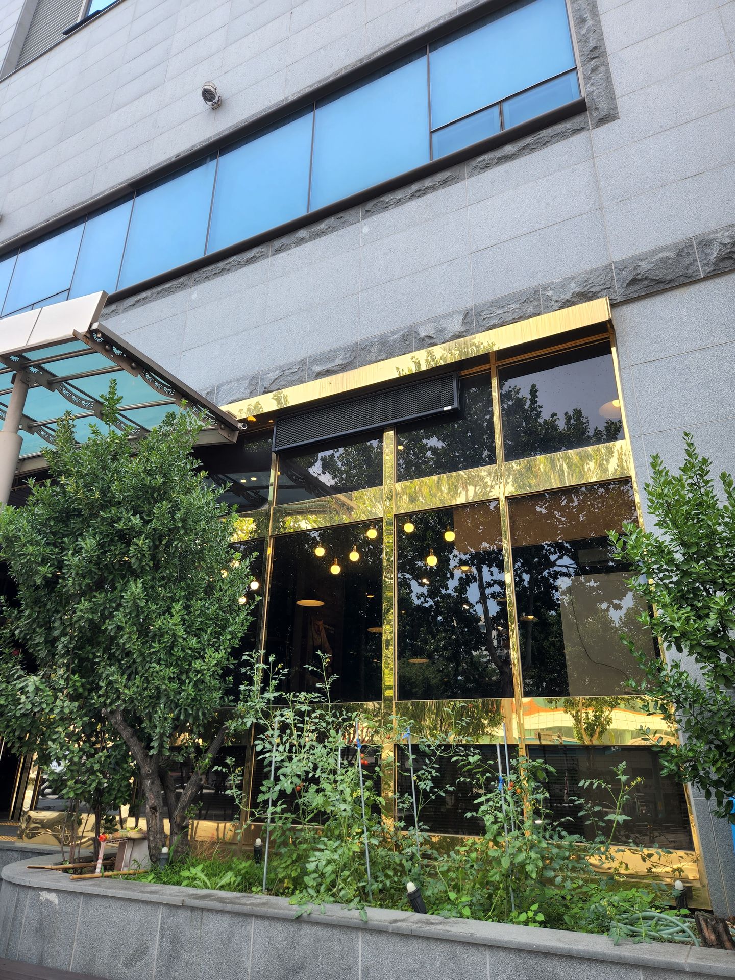 Gold MR의 만남. Gold MR 마감이 건물 출입문 프레임에 적용되어, 금빛 반사가 방문객에게 품격과 고급스러운 첫인상을 제공합니다. 프레임의 광택과 빛의 반사가 건물 입구에 안정감과 세련된 분위기를 부여하며, 전체 외관과 자연스럽게 어우러져 공간의 완성도를 높입니다.