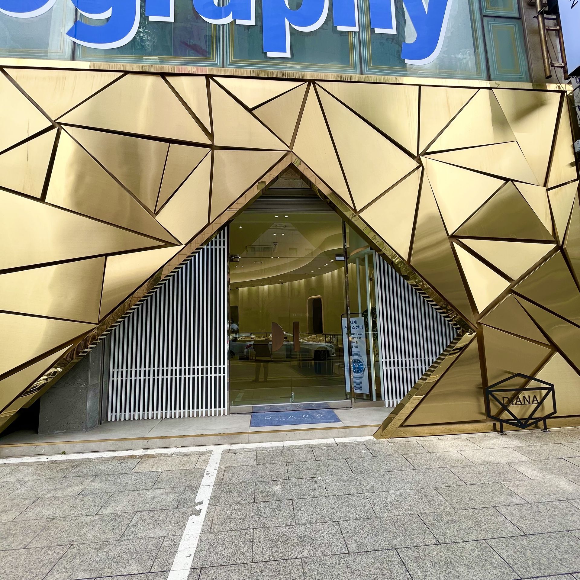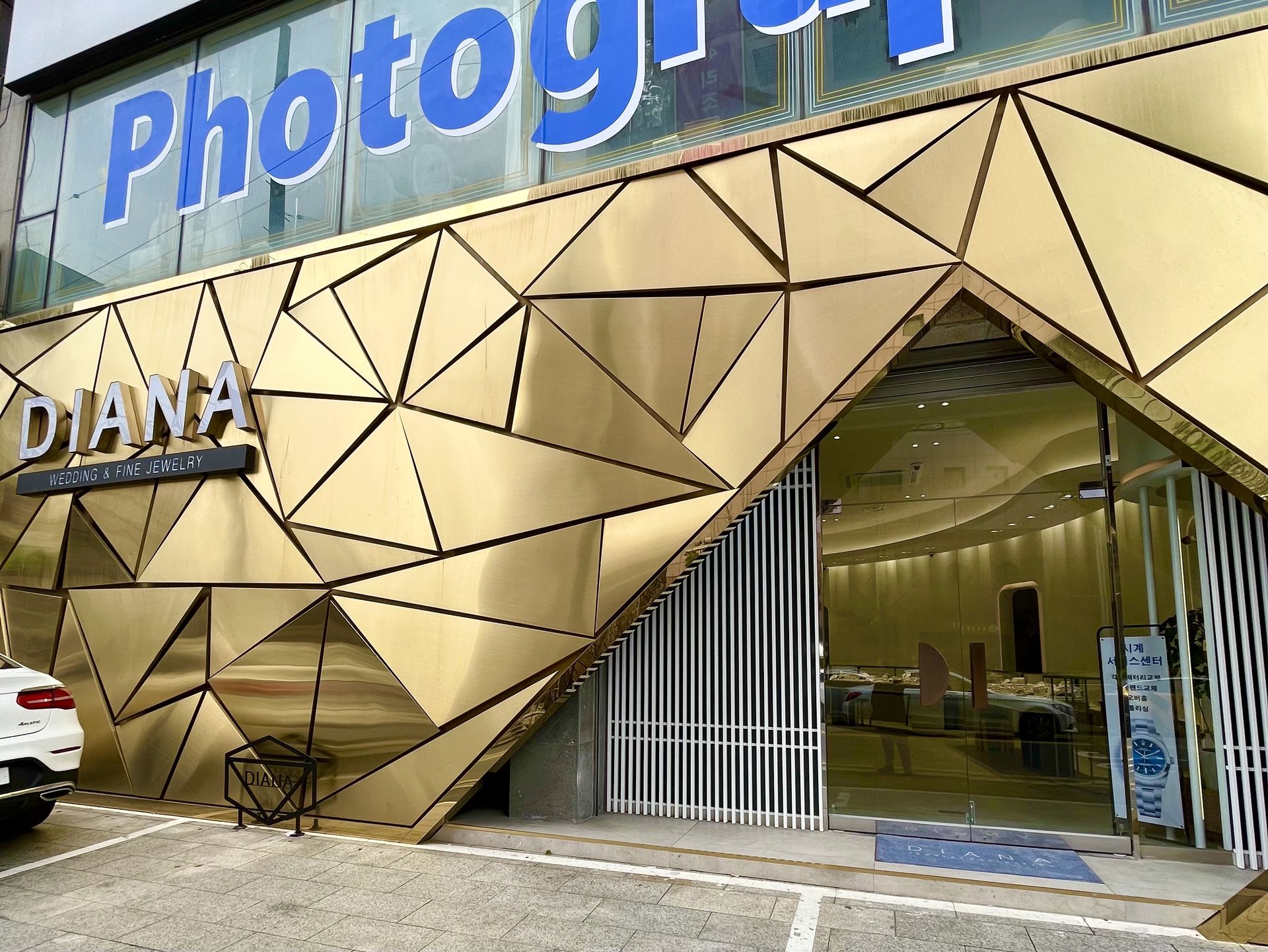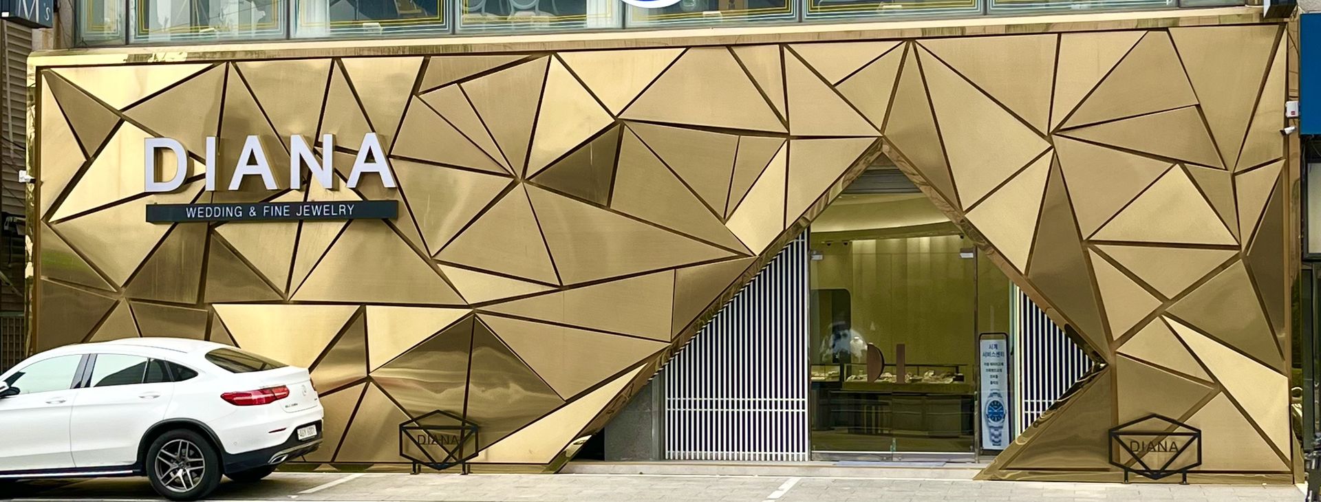 Gold MR와 Gold HL의 만남. 입구 외관은 Gold HL을 활용해 삼각형 입체 패턴을 구성하고, 그 아웃라인은 Gold MR로 마감했습니다. 보석을 깎아낸 듯한 형상은 쥬얼리숍의 콘셉트와 잘 맞아떨어집니다. 외관 전체가 다이내믹한 빛의 반사를 통해 원석 같은 깊이와 아름다움을 드러냅니다. 방문객들은 건물 외부만 보아도 특별한 공간임을 직감할 수 있습니다.