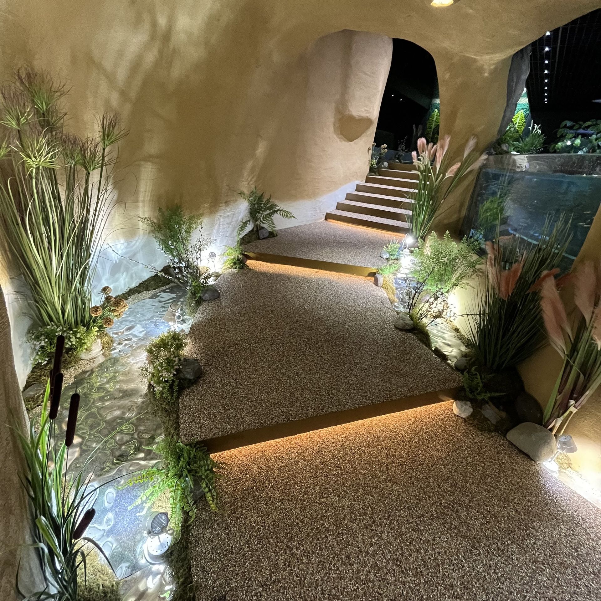 아쿠아리움 실내 조경 공간에는 Silver MR RIPPLE 제품을 적용해 자연의 흐름을 형상화했습니다. 벽면과 식물 배치가 어우러지며 양옆으로 시냇물이 흐르는 듯한 느낌을 줍니다. 파동 같은 패턴은 공간에 리듬감을 부여하고, 관람객에게 편안함을 선사합니다. 마치 수중 산책로를 걷는 듯한 특별한 경험을 제공합니다.
