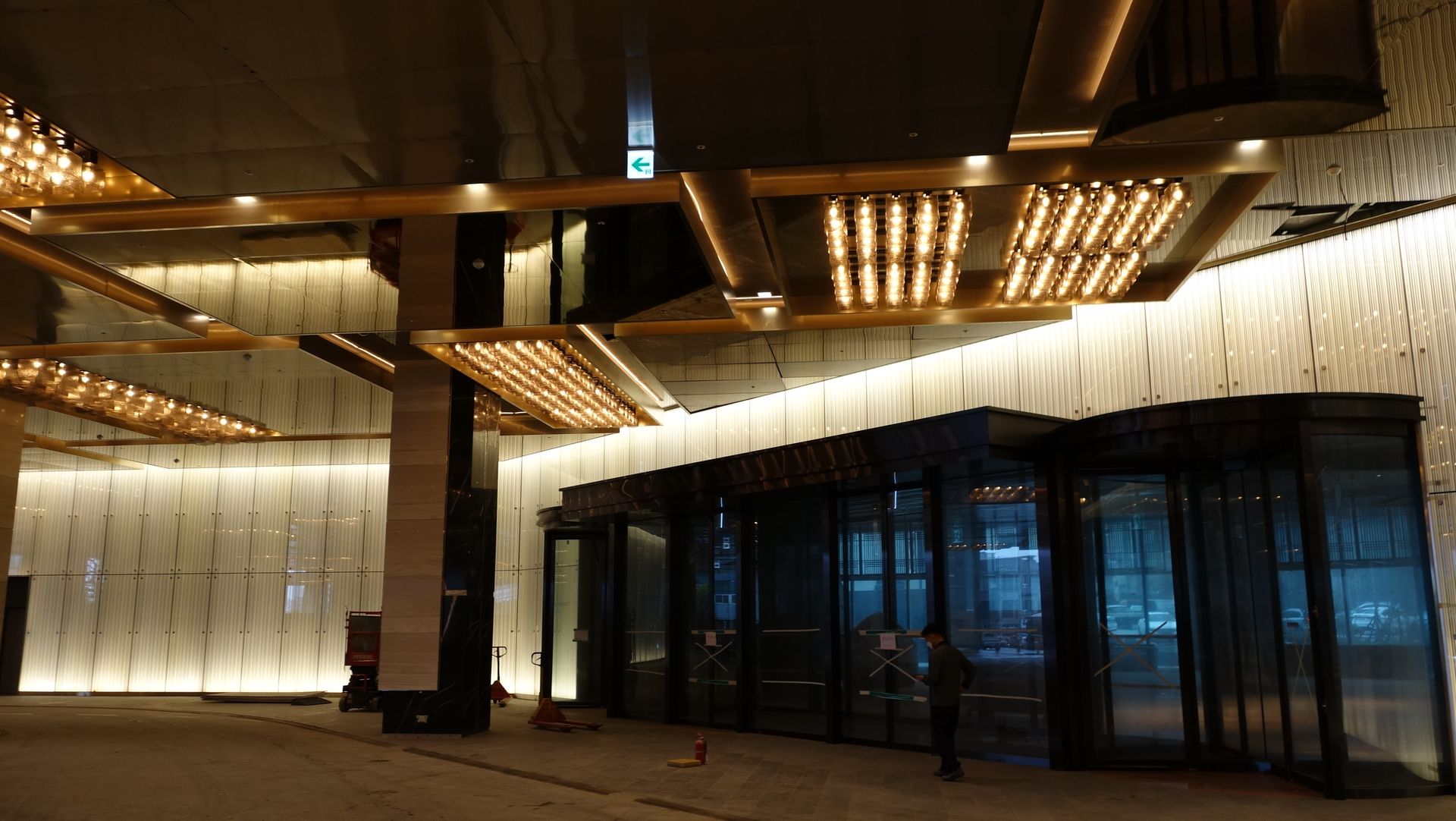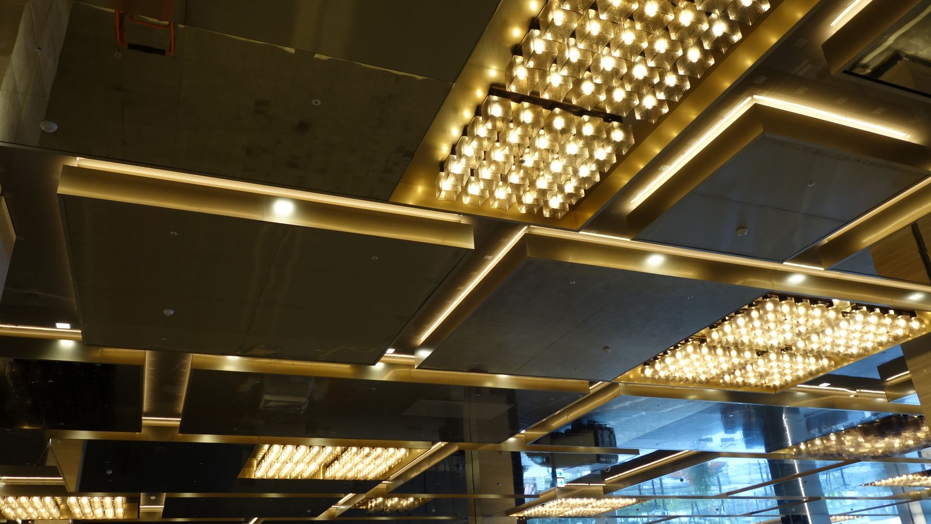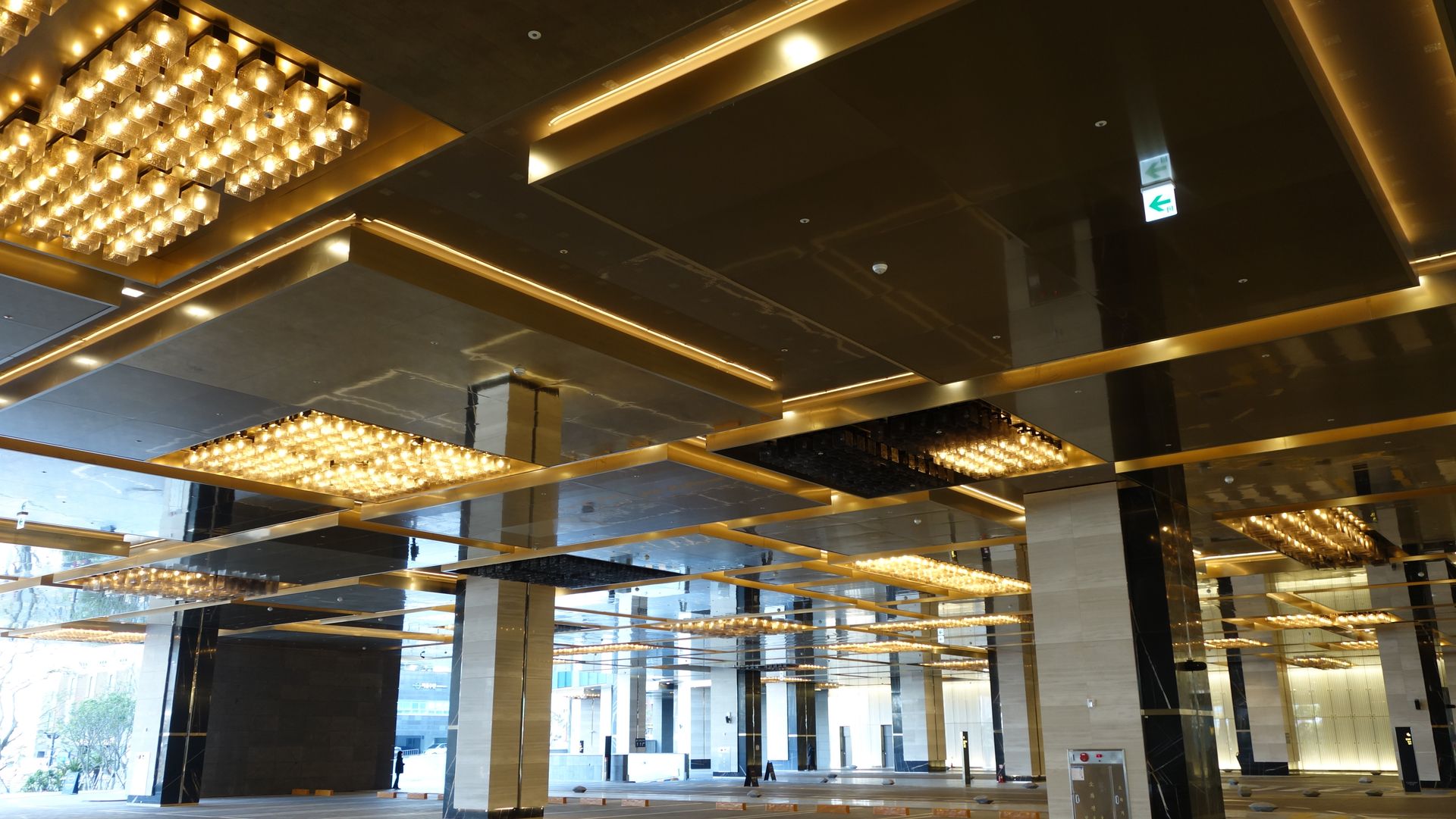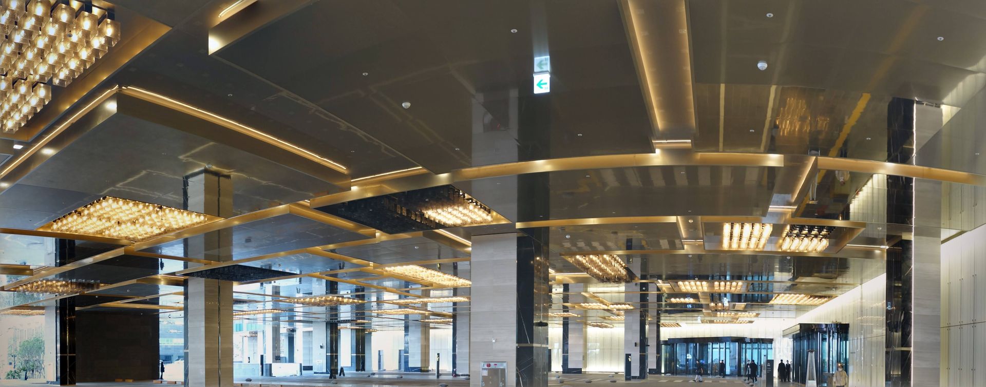 호텔 외부 로비 천장은 Champagne Gold HL, MR 그리고 MIST를 조합해 극도의 고급스러움을 연출했습니다. 사각형 단위로 구성된 천장은 조명과 함께 화려하면서도 절제된 아름다움을 드러냅니다. 다양한 골드 톤의 조화는 깊이감과 리듬을 형성하여 공간을 더욱 풍부하게 만듭니다. 방문객들은 입구에서부터 압도적인 분위기에 사로잡히게 됩니다.