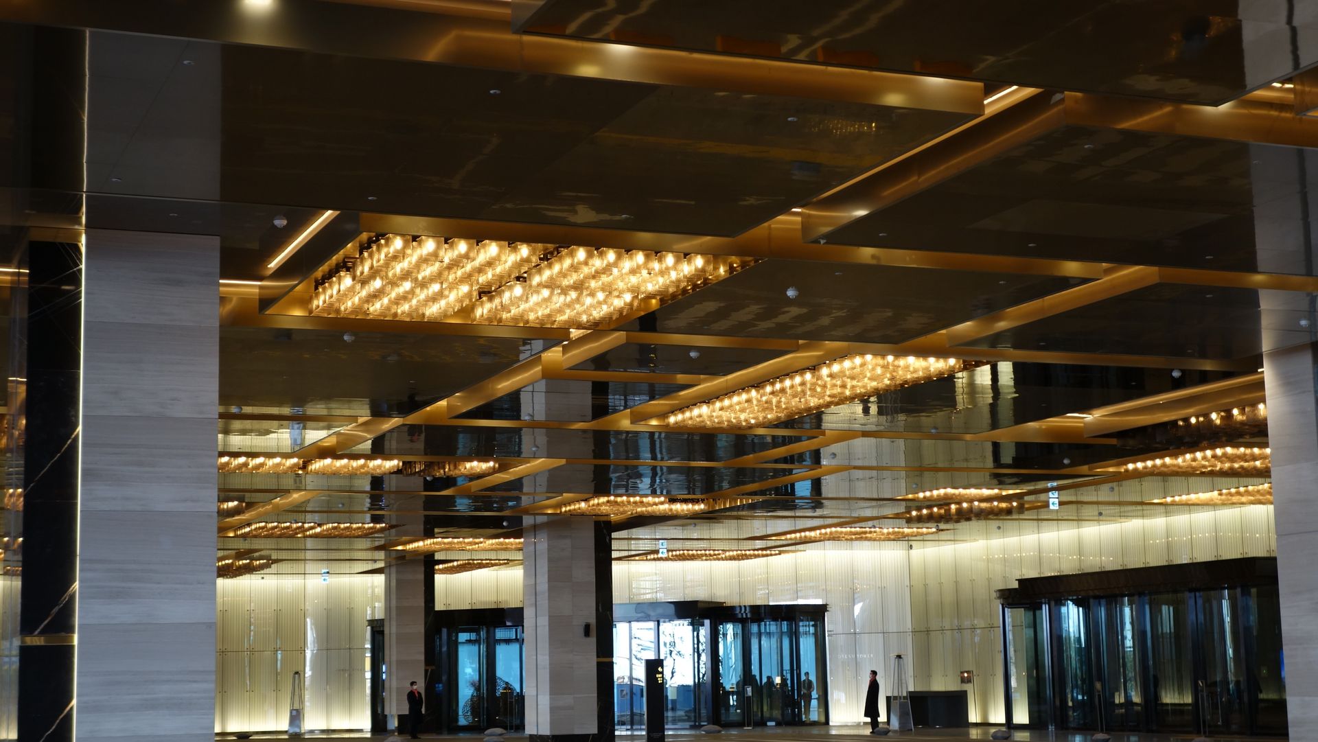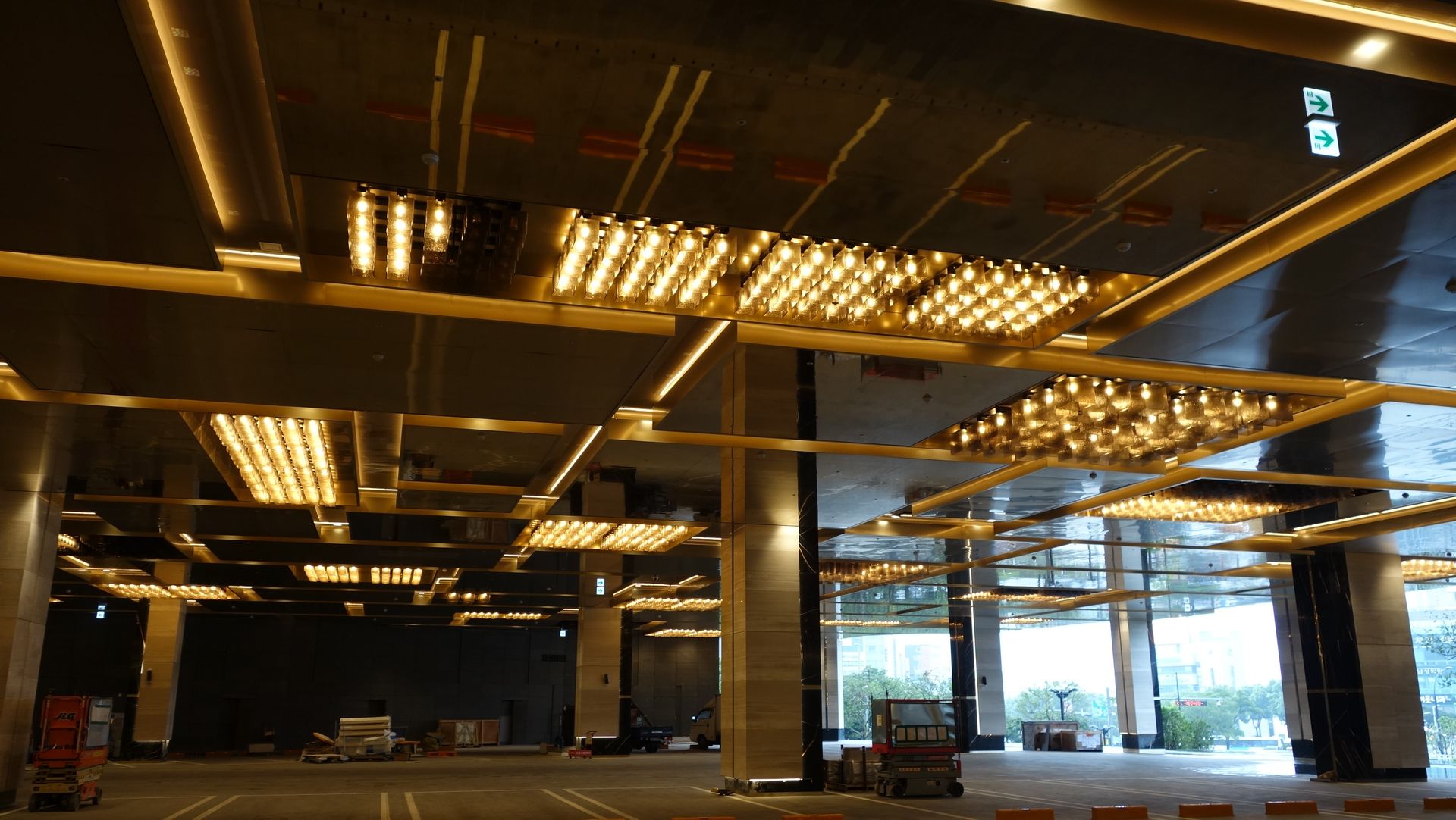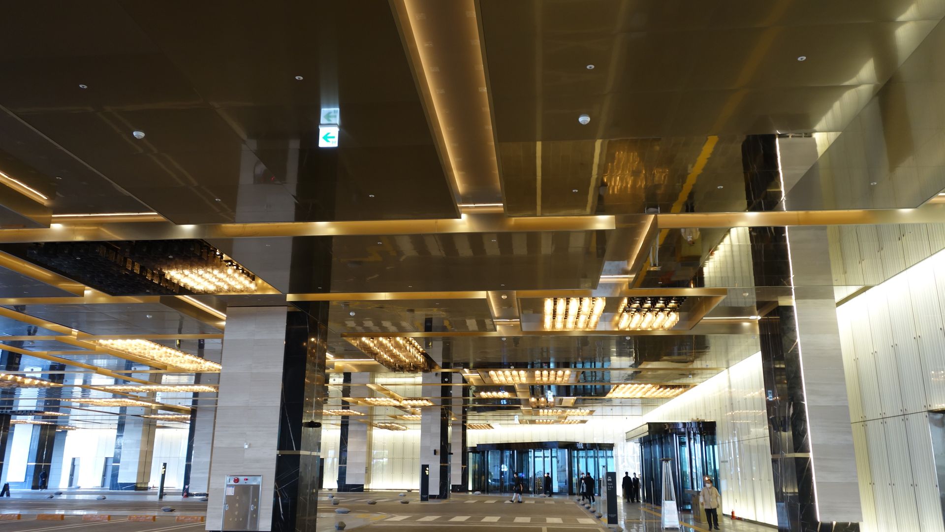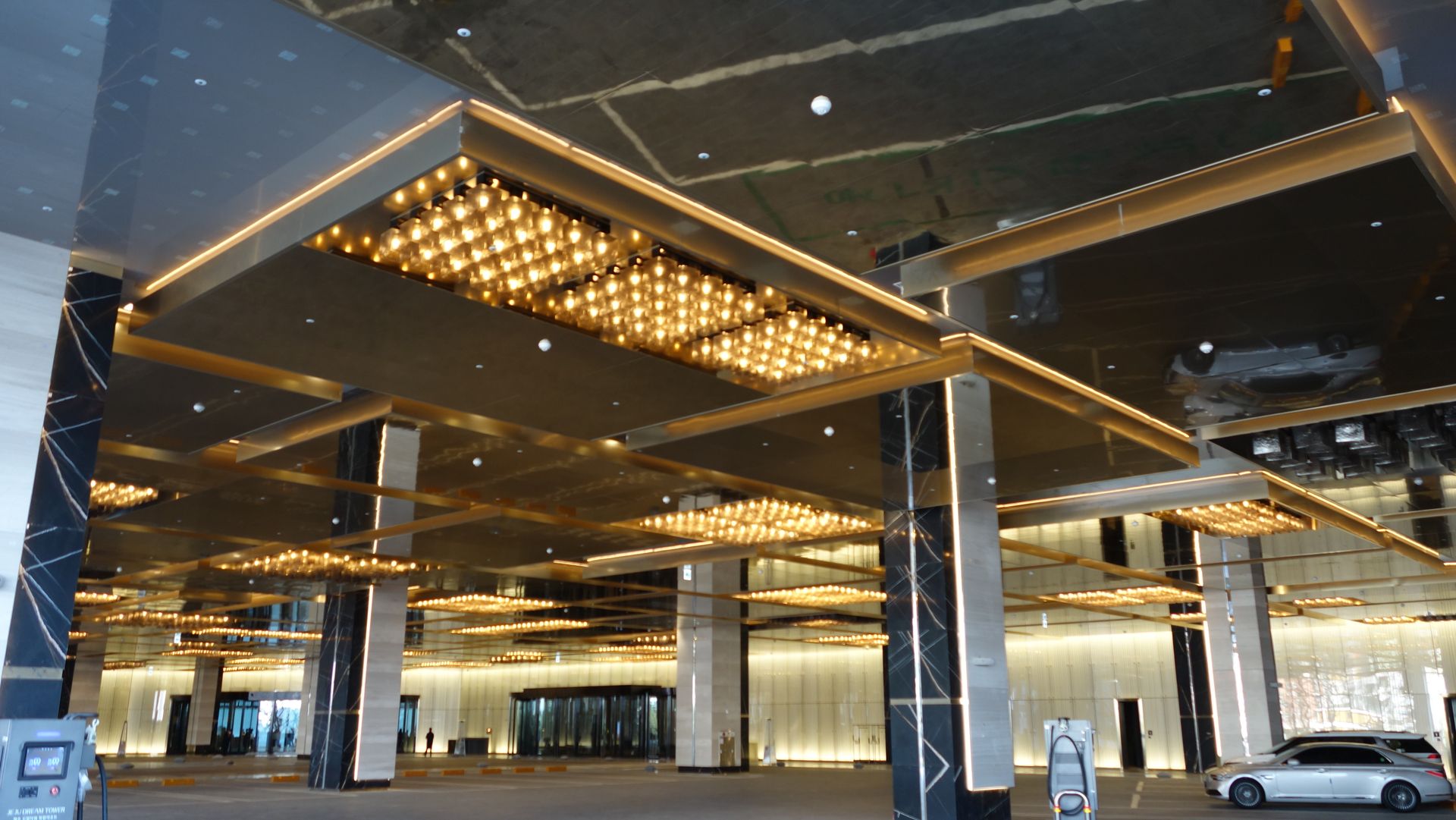 호텔 외부 로비 천장은 Champagne Gold HL, MR 그리고 MIST를 조합해 극도의 고급스러움을 연출했습니다. 사각형 단위로 구성된 천장은 조명과 함께 화려하면서도 절제된 아름다움을 드러냅니다. 다양한 골드 톤의 조화는 깊이감과 리듬을 형성하여 공간을 더욱 풍부하게 만듭니다. 방문객들은 입구에서부터 압도적인 분위기에 사로잡히게 됩니다.
