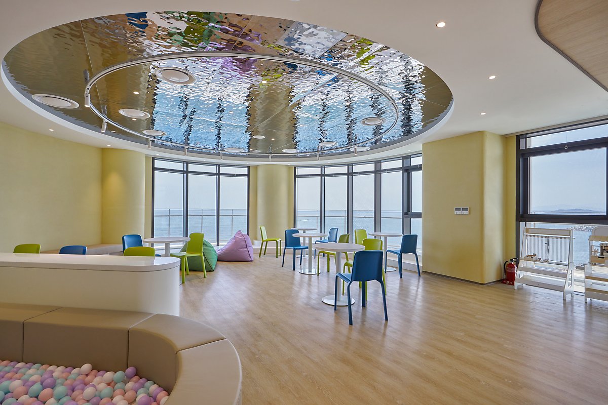 호텔 수영장의 천장을 Silver MR RIPPLE 제품으로 마감되어 물결이 퍼져 나가는 듯한 유려한 분위기를 형성했습니다. 바다를 조망할 수 있는 공간 위 천창에도 동일한 소재를 적용해 실내와 외부 풍경이 자연스럽게 이어지도록 연출했습니다. Ripple 특유의 불규칙한 물결무늬는 빛을 받아 마치 움직이는 듯한 반사 효과를 만들어내며 공간에 생동감을 더합니다. 이러한 디자인은 단순한 장식 요소를 넘어 공간 전체에 역동적이면서도 고급스러운 이미지를 부여했습니다. 결과적으로 공간 전체가 자연과 하나 된 듯한 세련된 감각을 전달합니다.