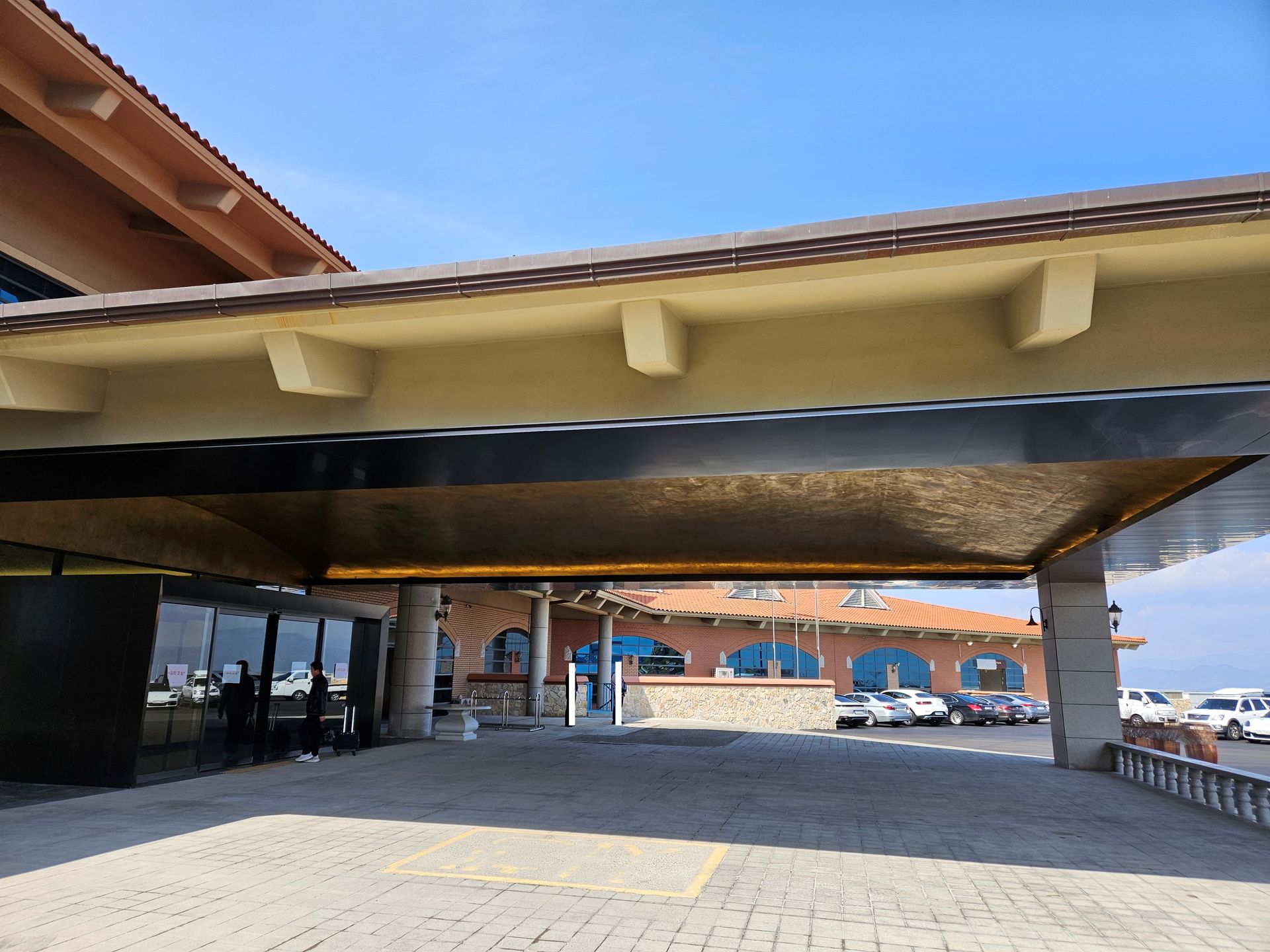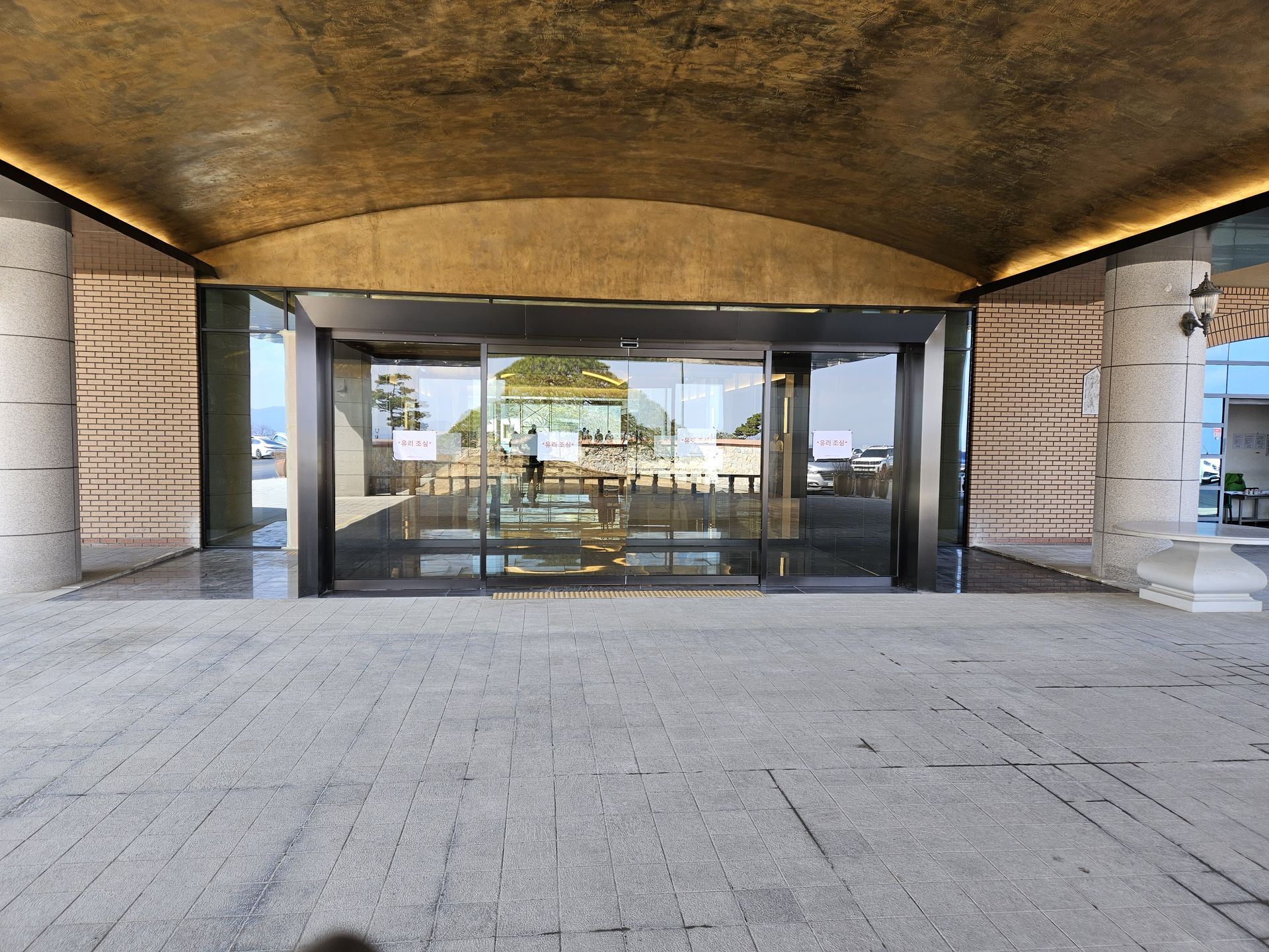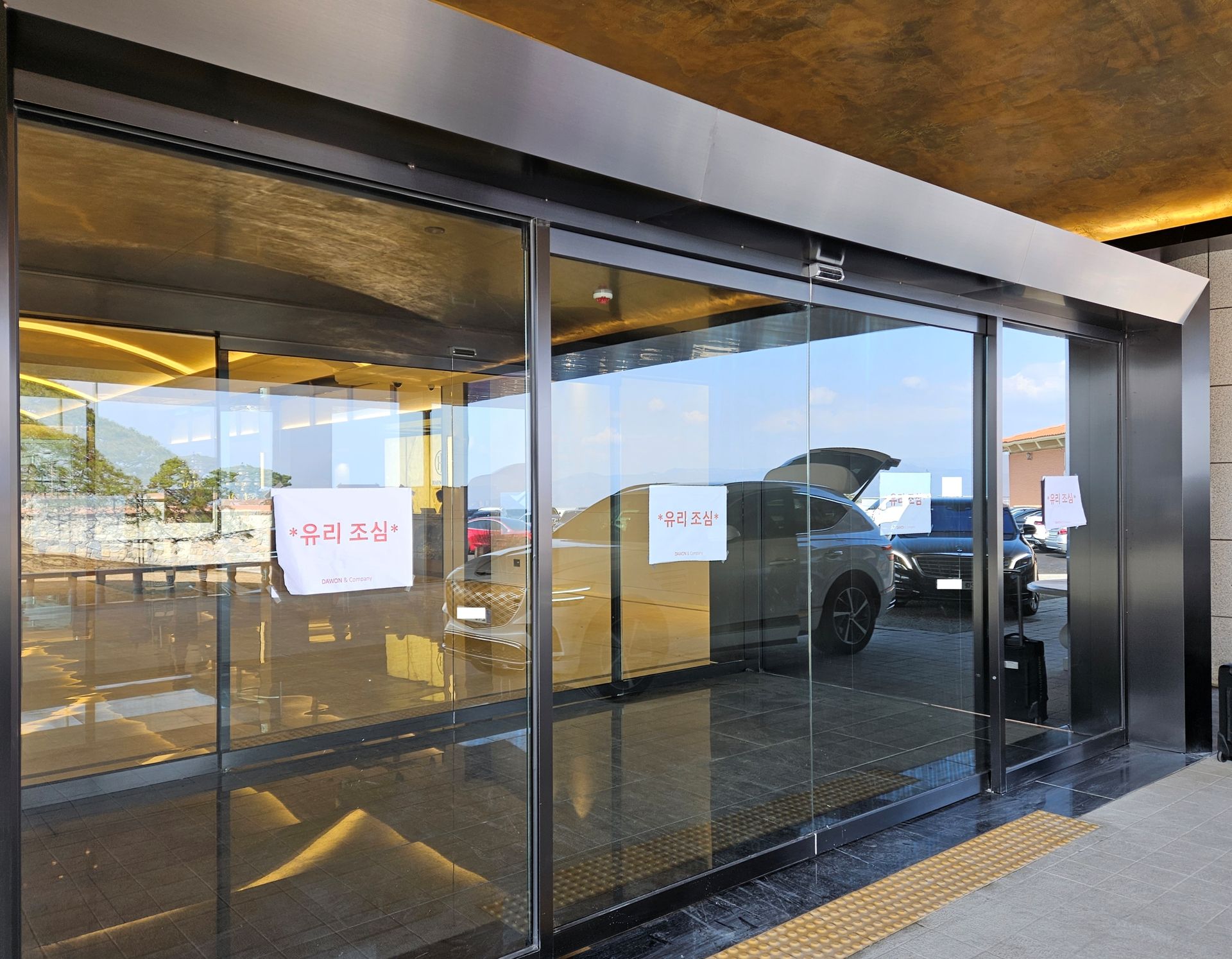 건물의 입구 출입문을 Galaxy black DRIZZLE로 마감되어 고급스러운 무게감을 더했습니다. 또한 캐노피 가장자리도 동일한 소재로 꾸며 일관된 디자인을 완성했습니다. 검은색 바탕에 DRIZZLE 무늬가 세련된 포인트 역할을 했습니다. 입구 전체가 강렬하면서도 세련된 이미지를 전달했습니다. 이러한 마감은 고급 시설의 품격을 한층 더 높여주었습니다.