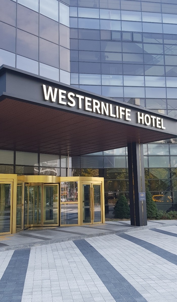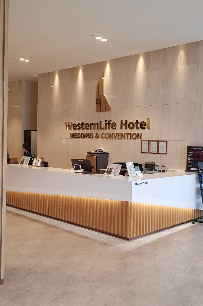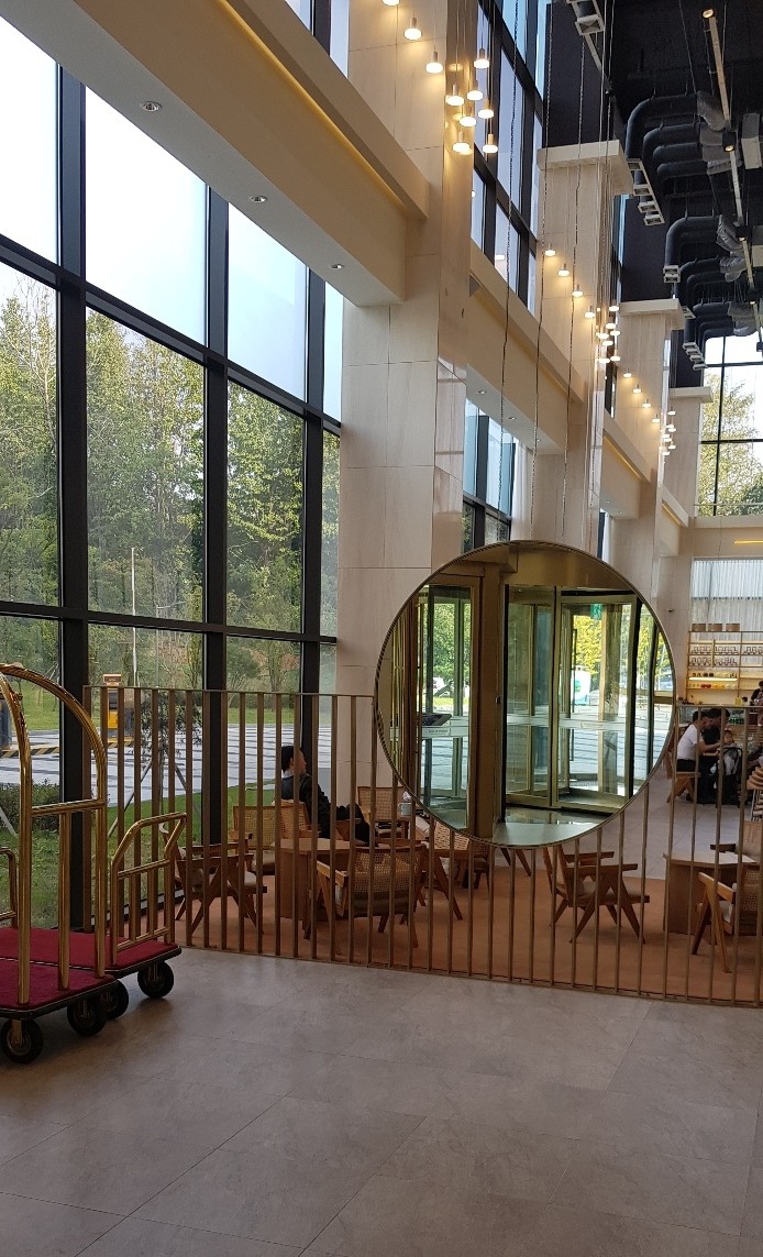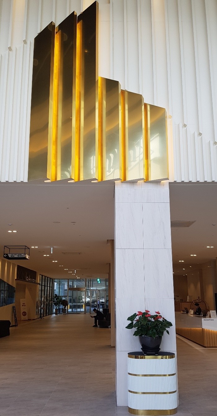 The entrance, which defines the first impression of a building, features a gold stainless steel finish that serves as a symbol of the space’s identity.