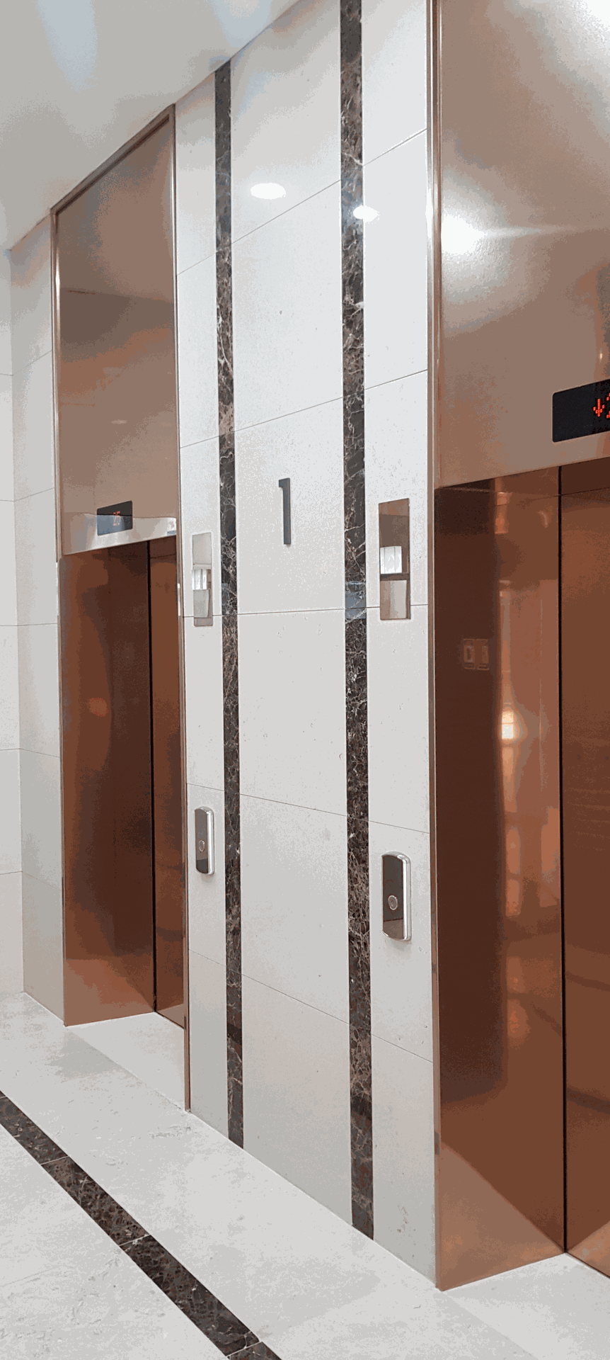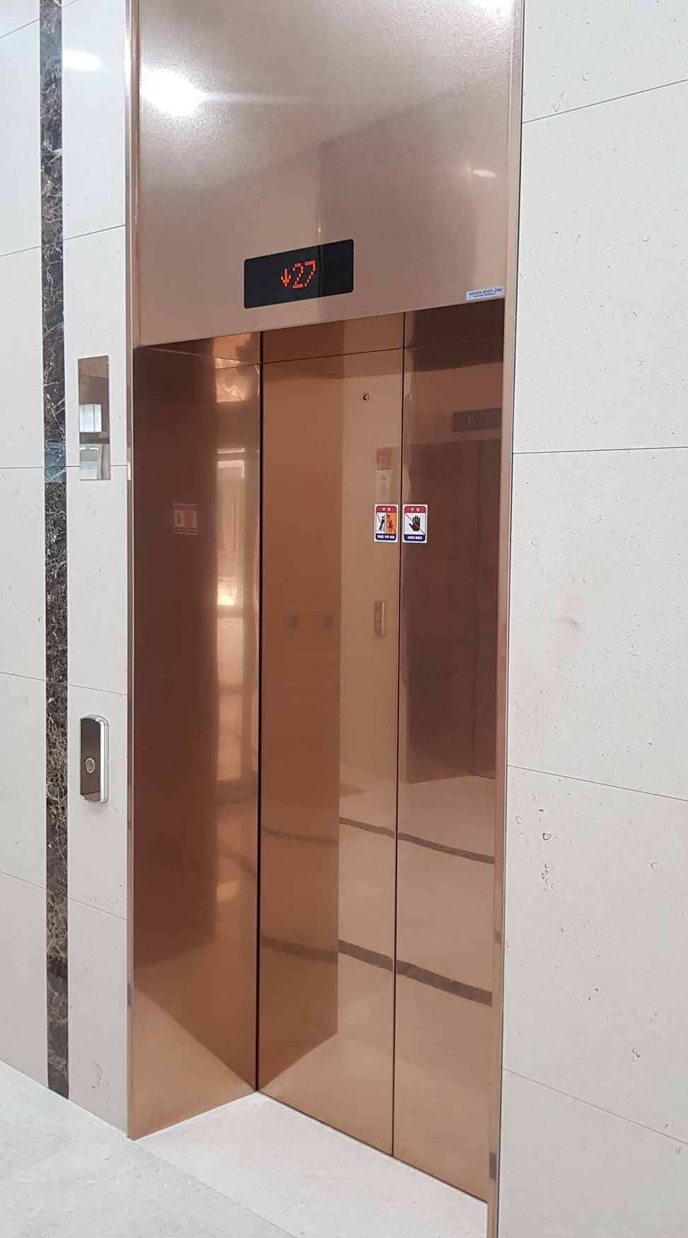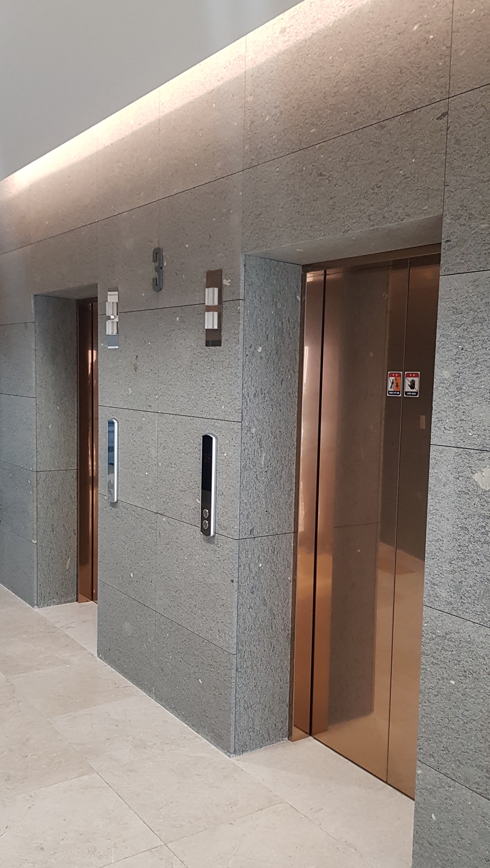 엘리베이터 출입부는 Whiskey Brown HANJI 마감으로 꾸며져, 따뜻하면서도 차분한 분위기를 자아냅니다.