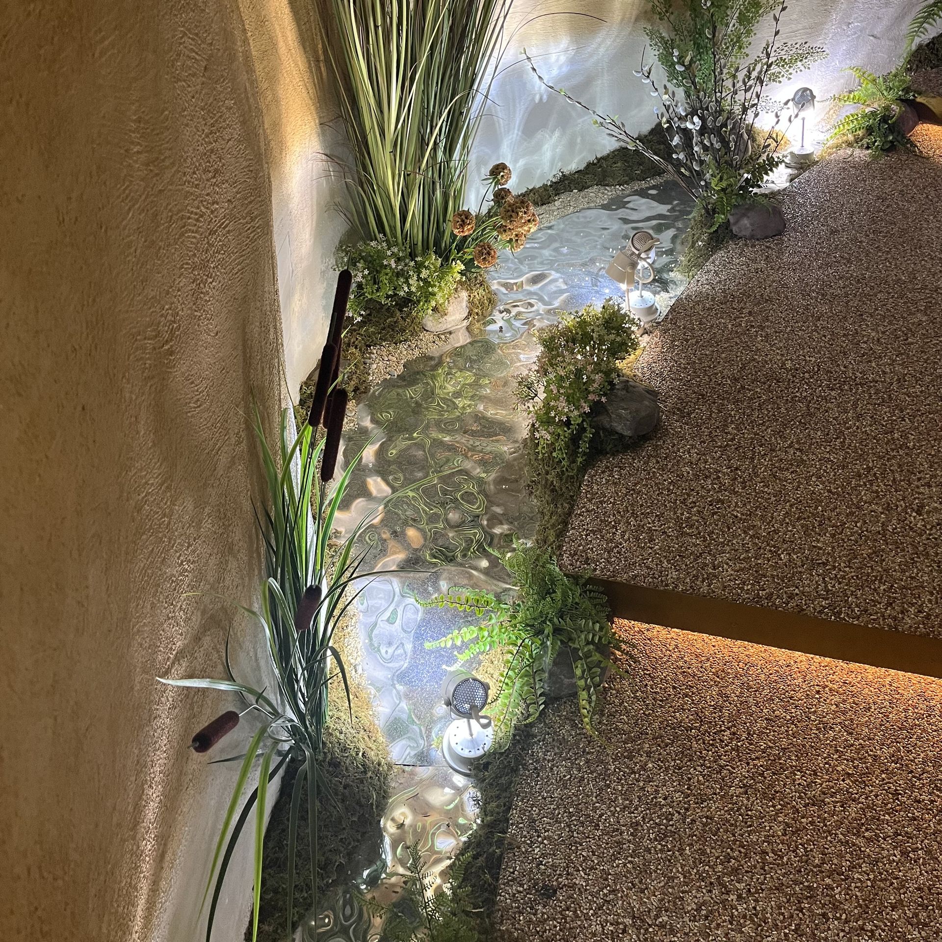 아쿠아리움 실내 조경 공간에는 Silver MR RIPPLE 제품을 적용해 자연의 흐름을 형상화했습니다. 벽면과 식물 배치가 어우러지며 양옆으로 시냇물이 흐르는 듯한 느낌을 줍니다. 파동 같은 패턴은 공간에 리듬감을 부여하고, 관람객에게 편안함을 선사합니다. 마치 수중 산책로를 걷는 듯한 특별한 경험을 제공합니다.