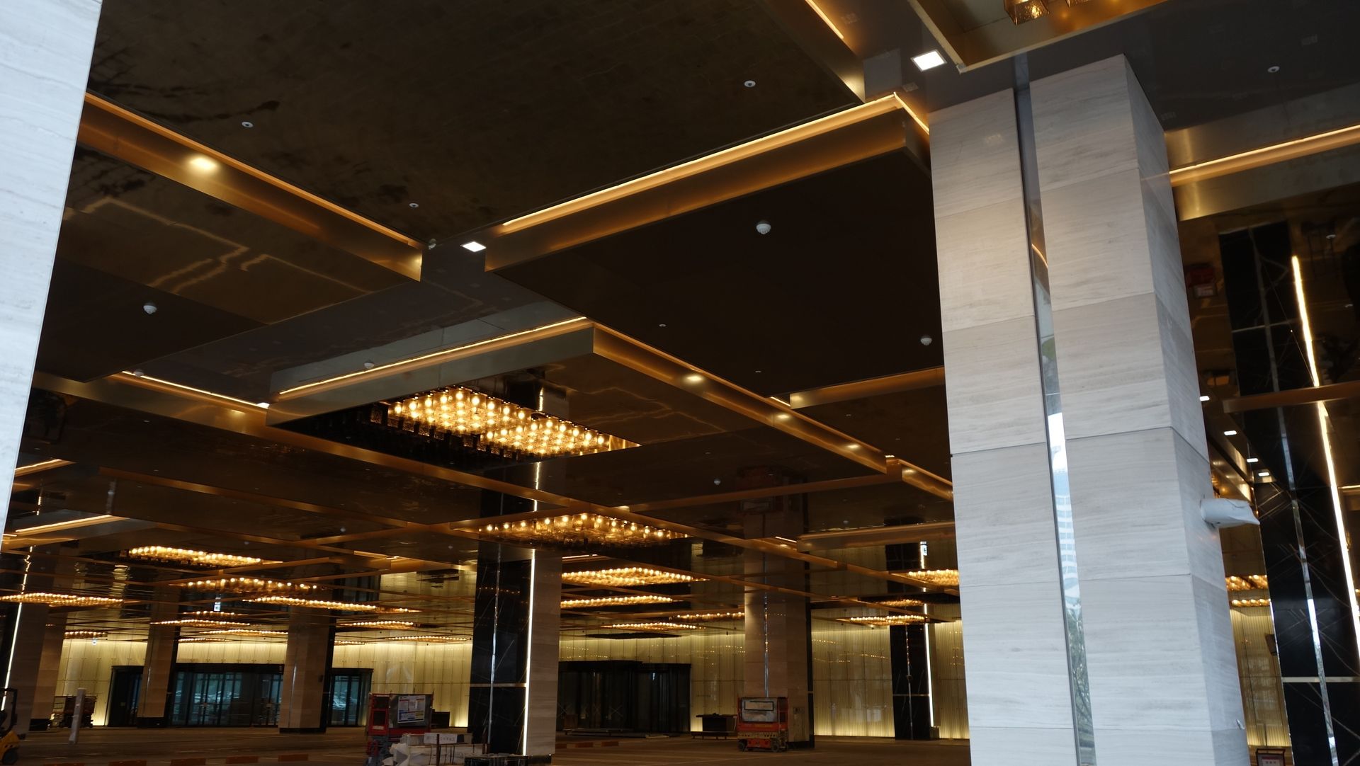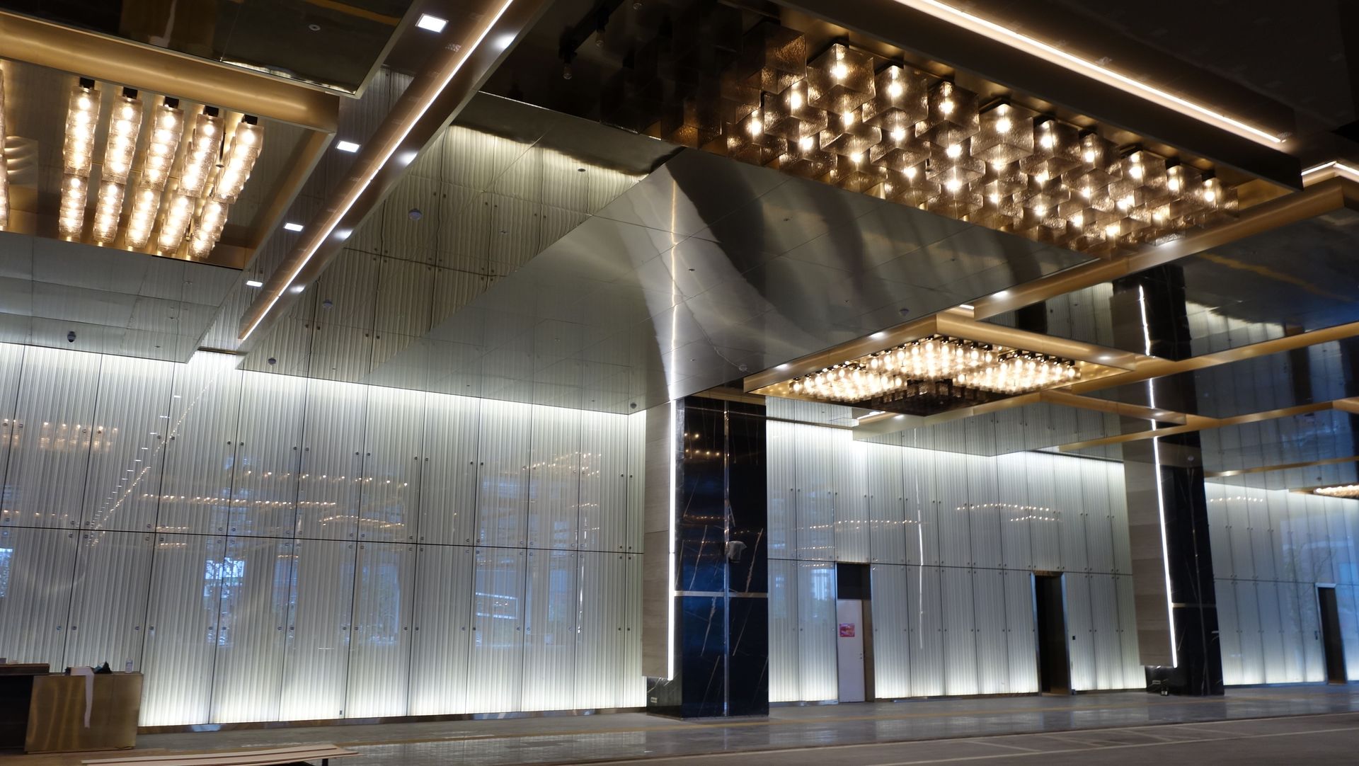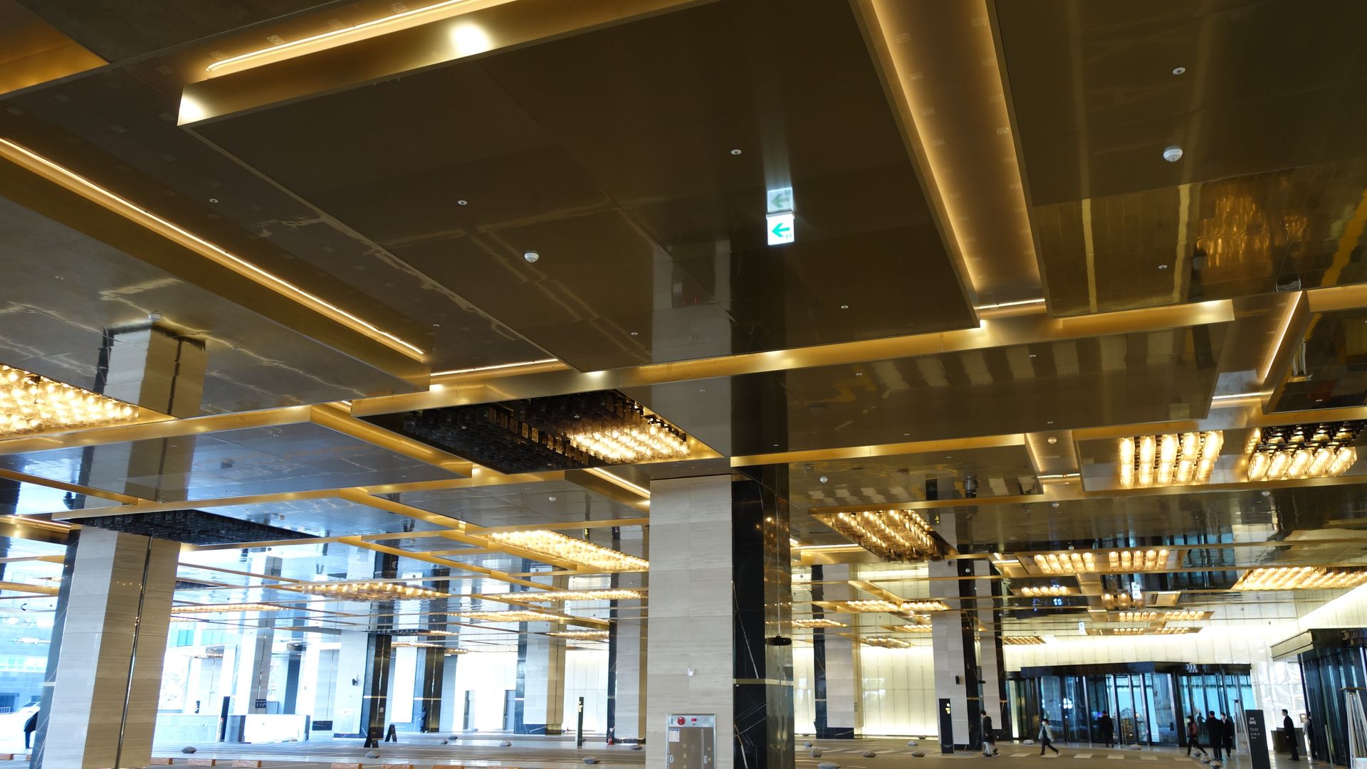 호텔 외부 로비 천장은 Champagne Gold HL, MR 그리고 MIST를 조합해 극도의 고급스러움을 연출했습니다. 사각형 단위로 구성된 천장은 조명과 함께 화려하면서도 절제된 아름다움을 드러냅니다. 다양한 골드 톤의 조화는 깊이감과 리듬을 형성하여 공간을 더욱 풍부하게 만듭니다. 방문객들은 입구에서부터 압도적인 분위기에 사로잡히게 됩니다.