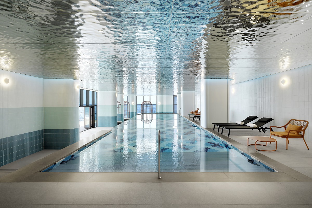 The ceiling of the hotel swimming pool was finished with Silver MR RIPPLE, creating an elegant atmosphere reminiscent of spreading waves. The same material was applied to the skylight above the ocean-view seating area, allowing the interior and the surrounding landscape to flow seamlessly together. The distinctive irregular wave patterns of RIPPLE reflect light in a way that produces a moving, shimmering effect, bringing vitality to the space. This design goes beyond mere decoration, imparting a dynamic yet refined image to the entire area. As a result, the overall space conveys a sophisticated sense of harmony with nature.