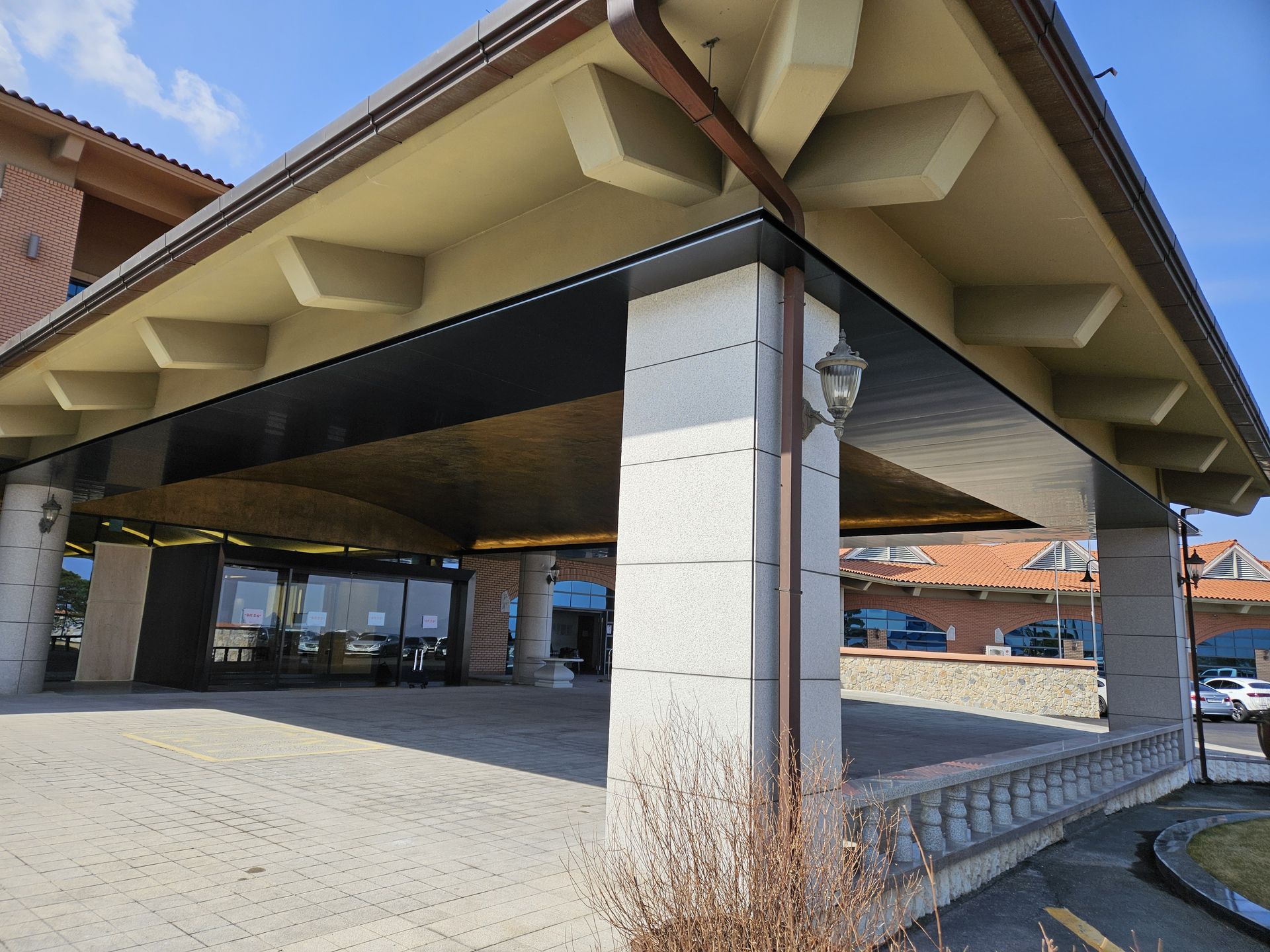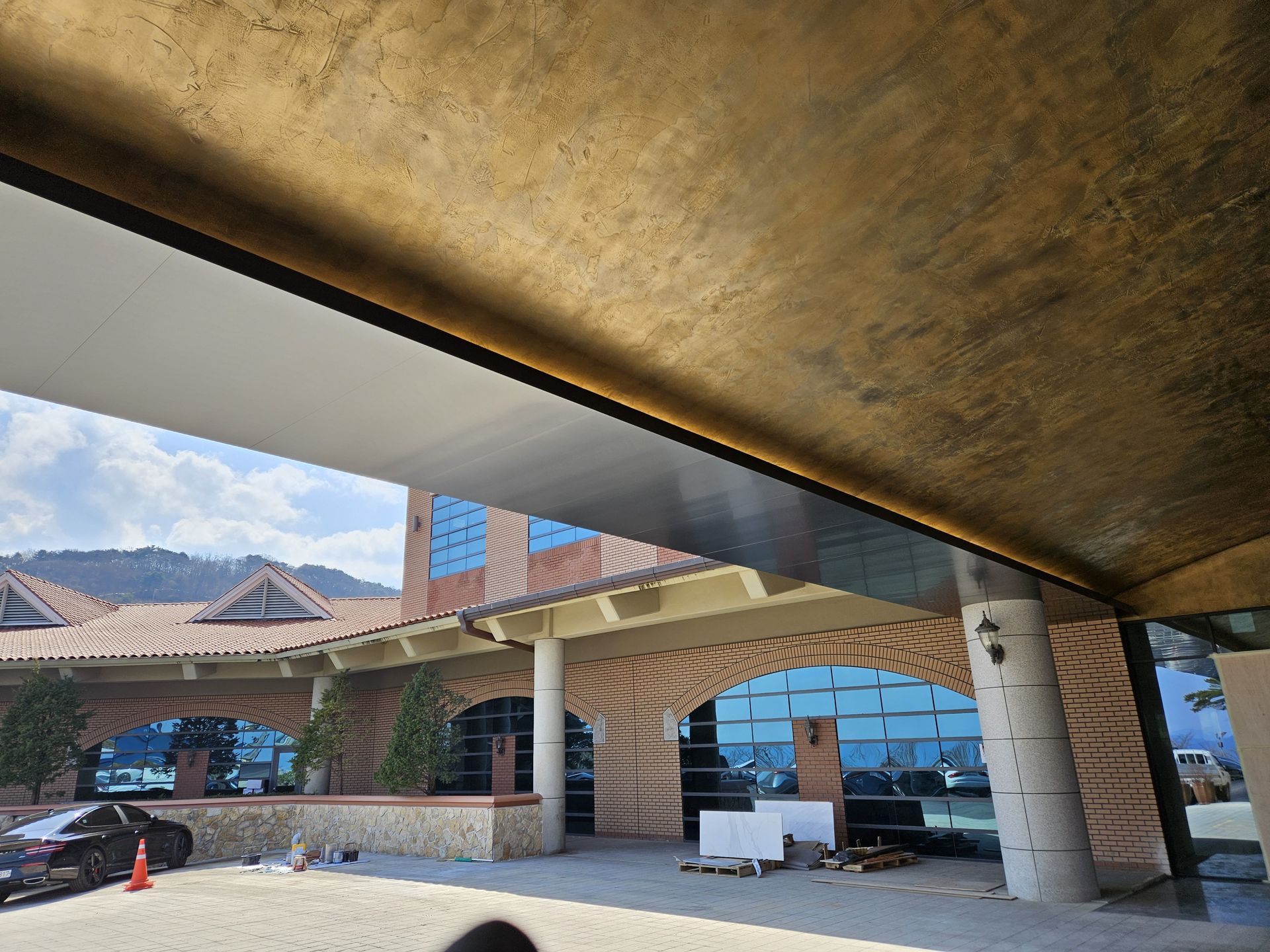 The entrance doors of the golf building were finished with Galaxy Black DRIZZLE, adding a luxurious sense of weight. The edges of the canopy were also decorated with the same material, achieving a consistent design. The DRIZZLE pattern on the black surface served as an elegant accent. The entire entrance conveyed a bold yet refined image. This finishing touch further enhanced the prestige of the premium golf facility.