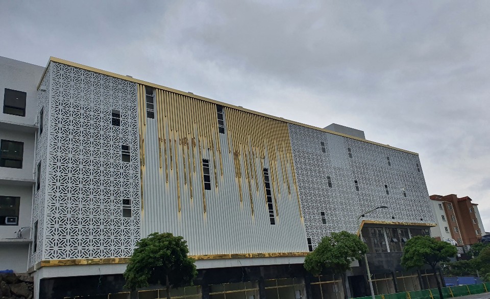 The Gold MR finish transforms the façade into a symbolic architectural element, defined by its intense reflectivity and luxurious sheen. By day, it engages in a dialogue with the urban surroundings, while at night it interacts with artificial lighting to create a striking, theatrical presence. The vertical alignment of the panels introduces rhythm and structural elegance, where light and shadow interplay to heighten visual tension. Through the consistent application of this material, the design achieves a sense of unity and refined sophistication across the entire building.