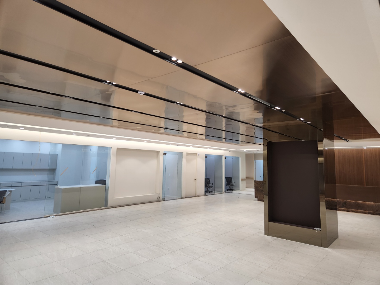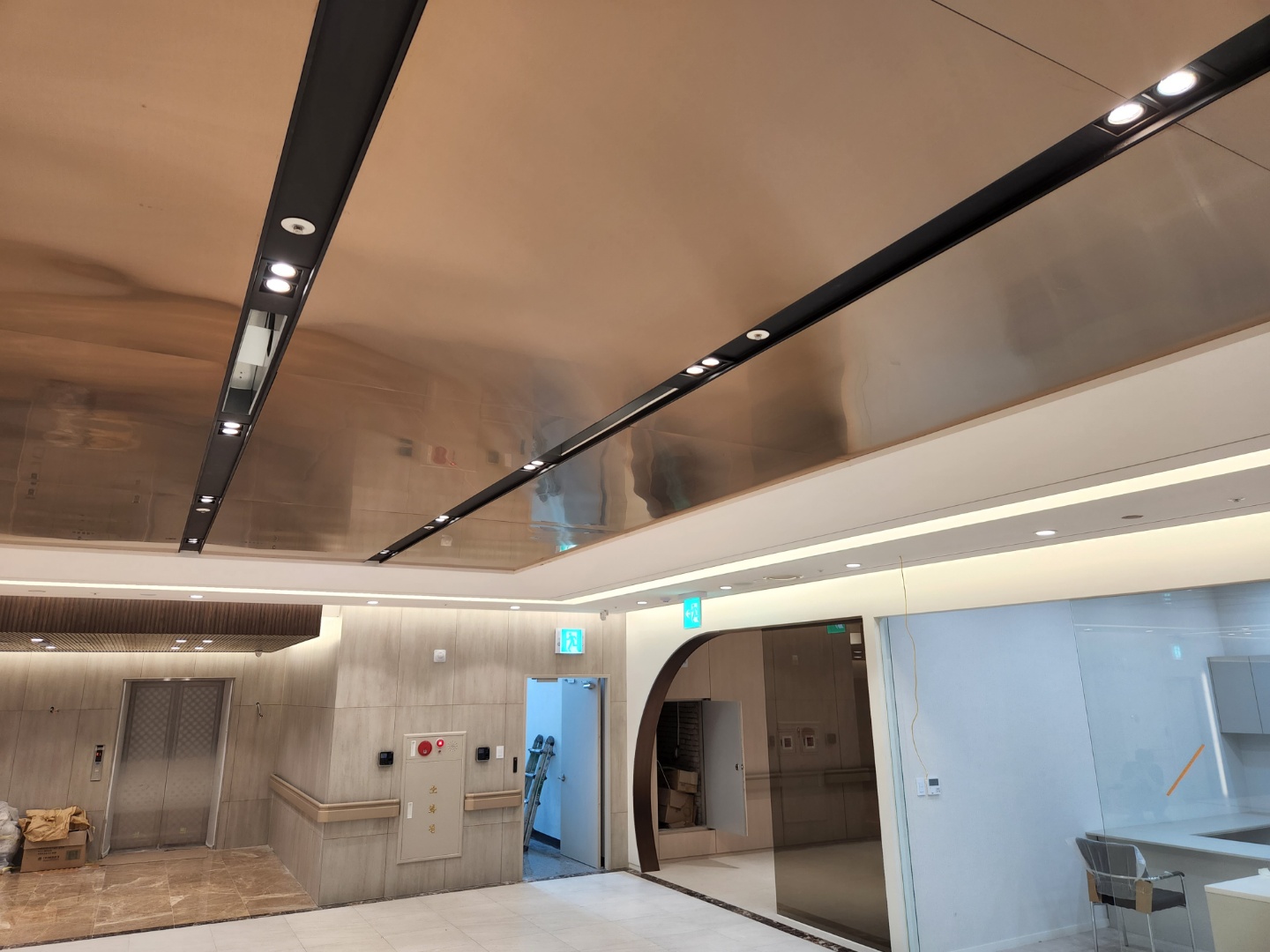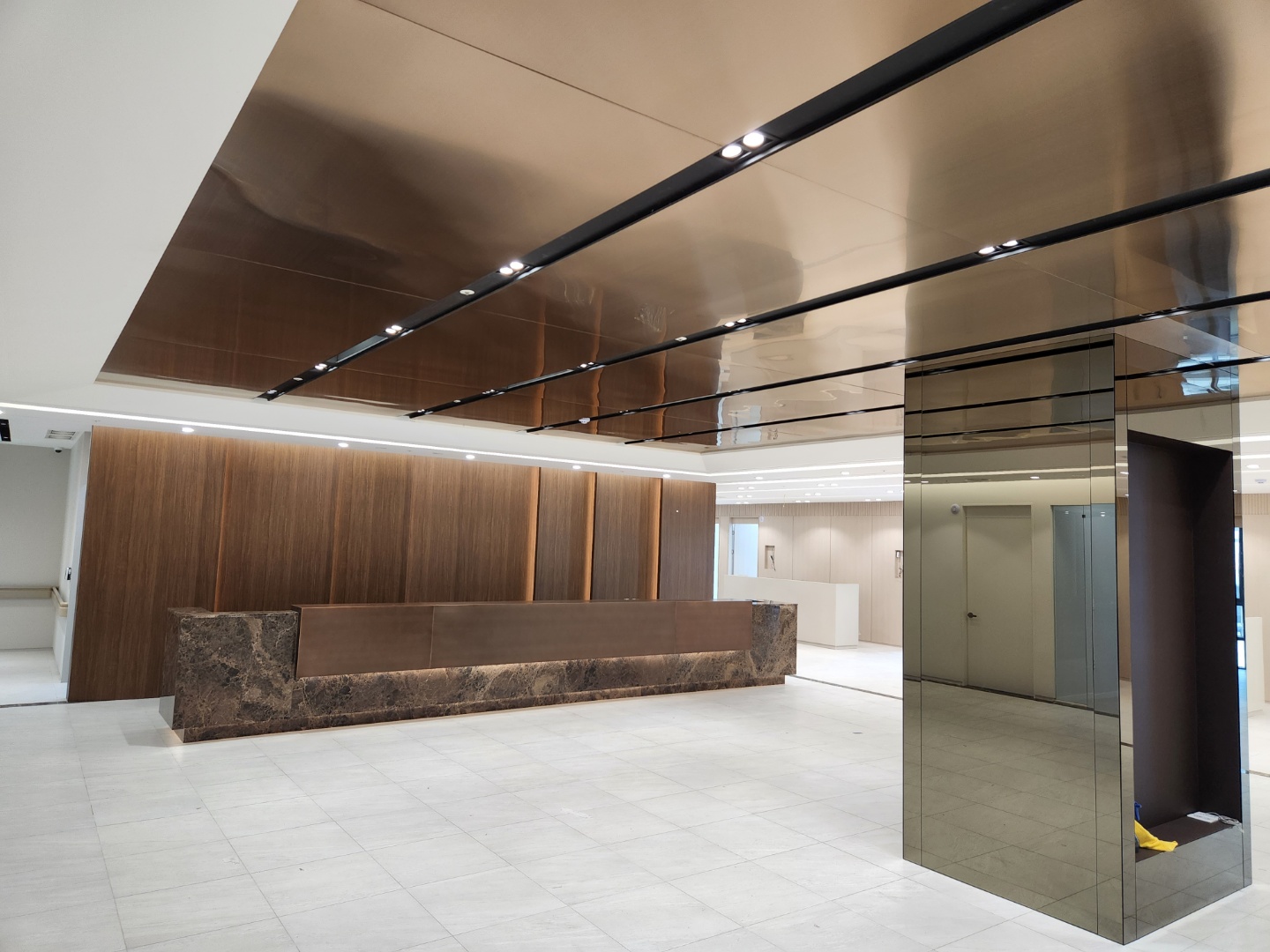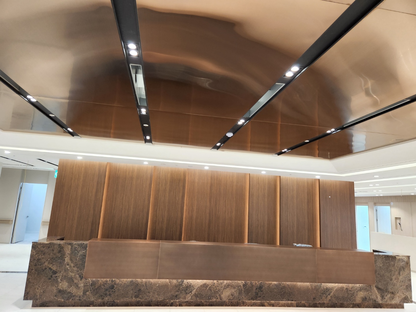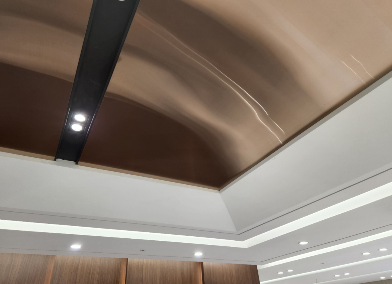 The Whiskey Brown HL finish applied to the ceiling emits rich brown tone combined with subtle hairline texture creates a warm and grounded atmosphere, while the surface’s gentle variations with light and angle emphasize the ceiling’s dimensionality. This finish demonstrates how architectural detailing can enhance the quality of the spatial experience while maintaining a comfortable ambiance..