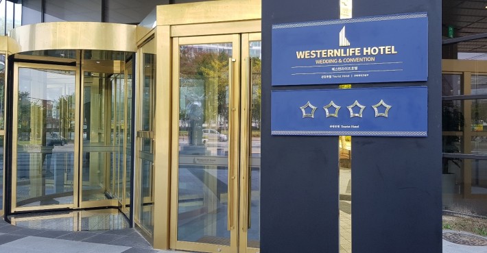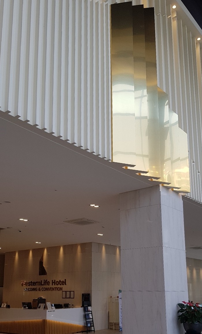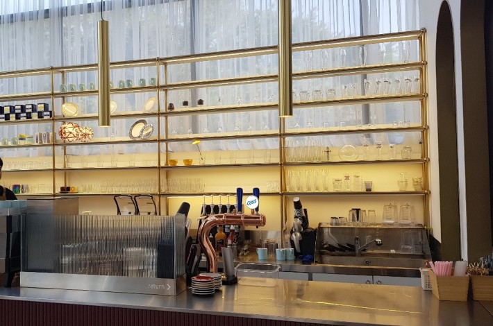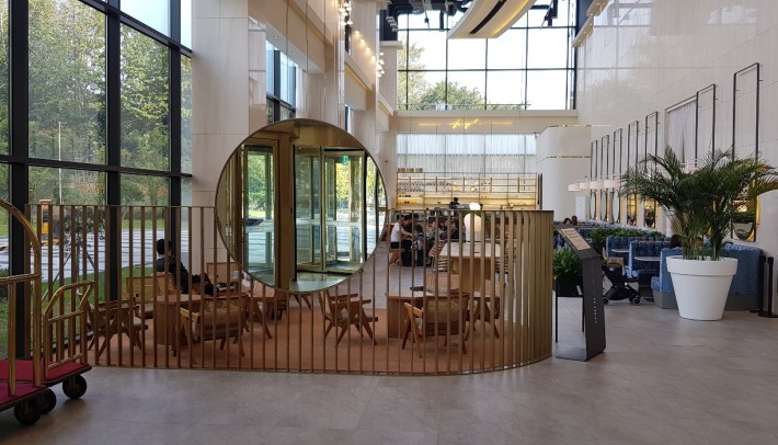 The entrance, which defines the first impression of a building, features a gold stainless steel finish that serves as a symbol of the space’s identity.